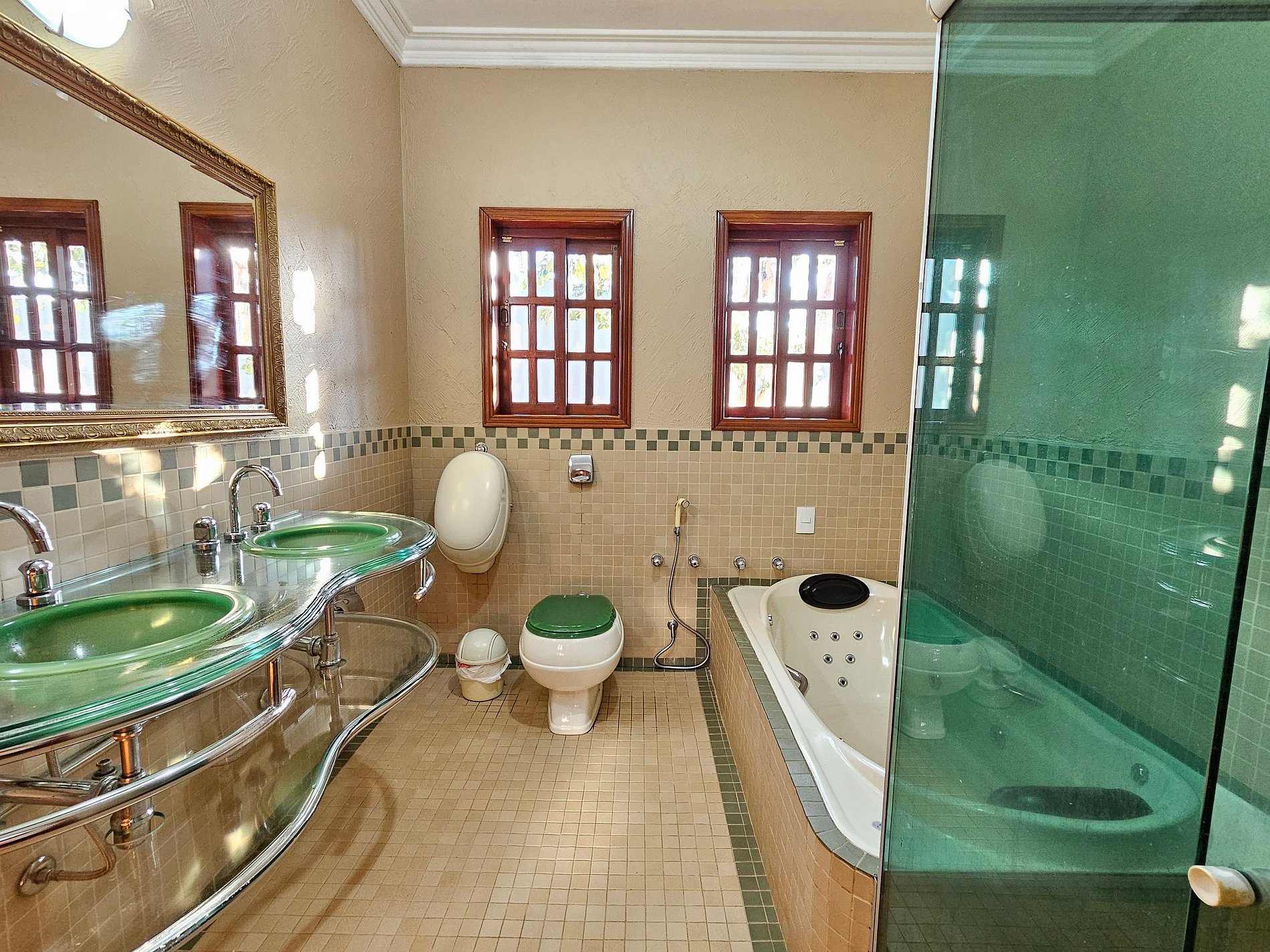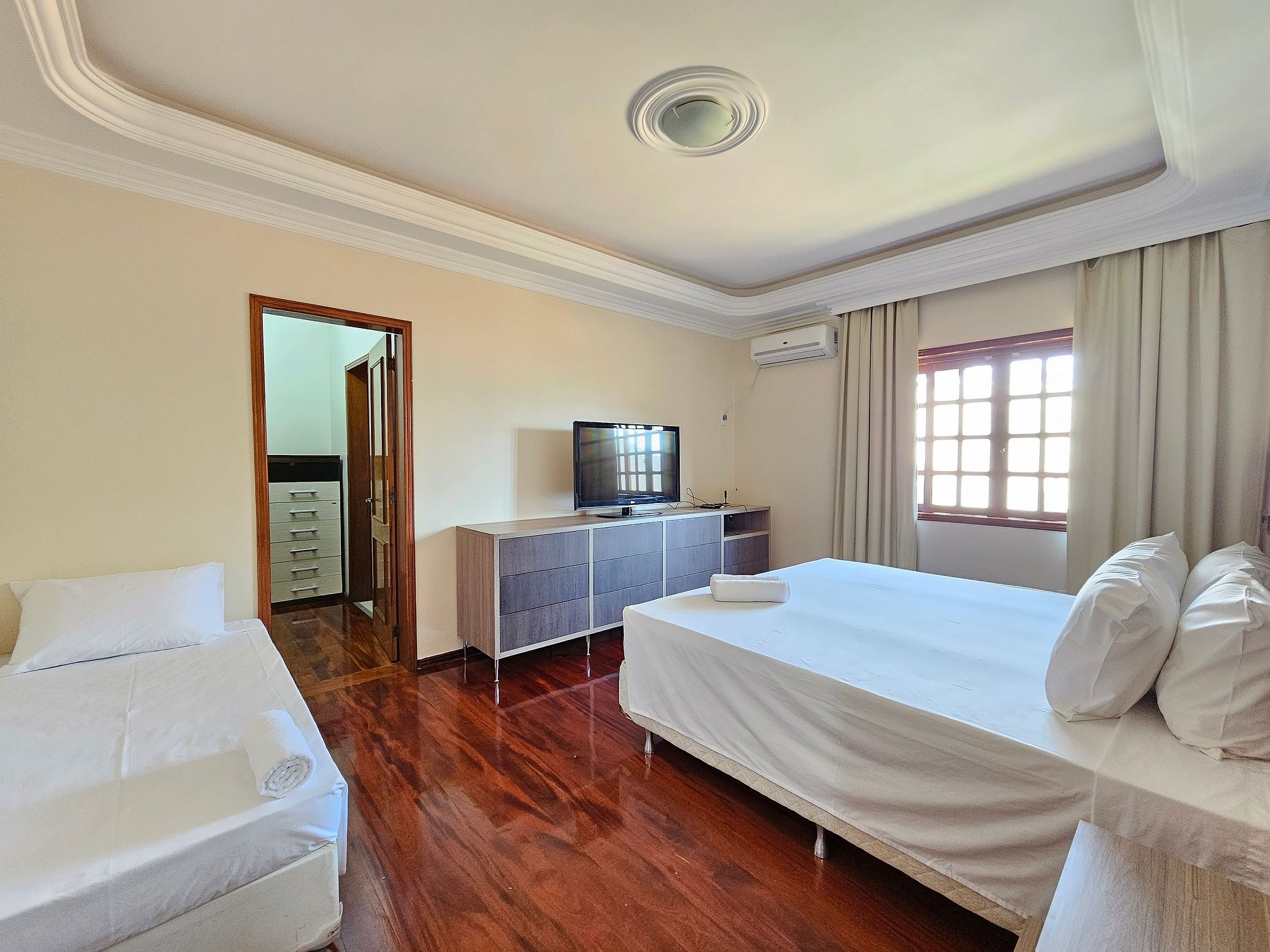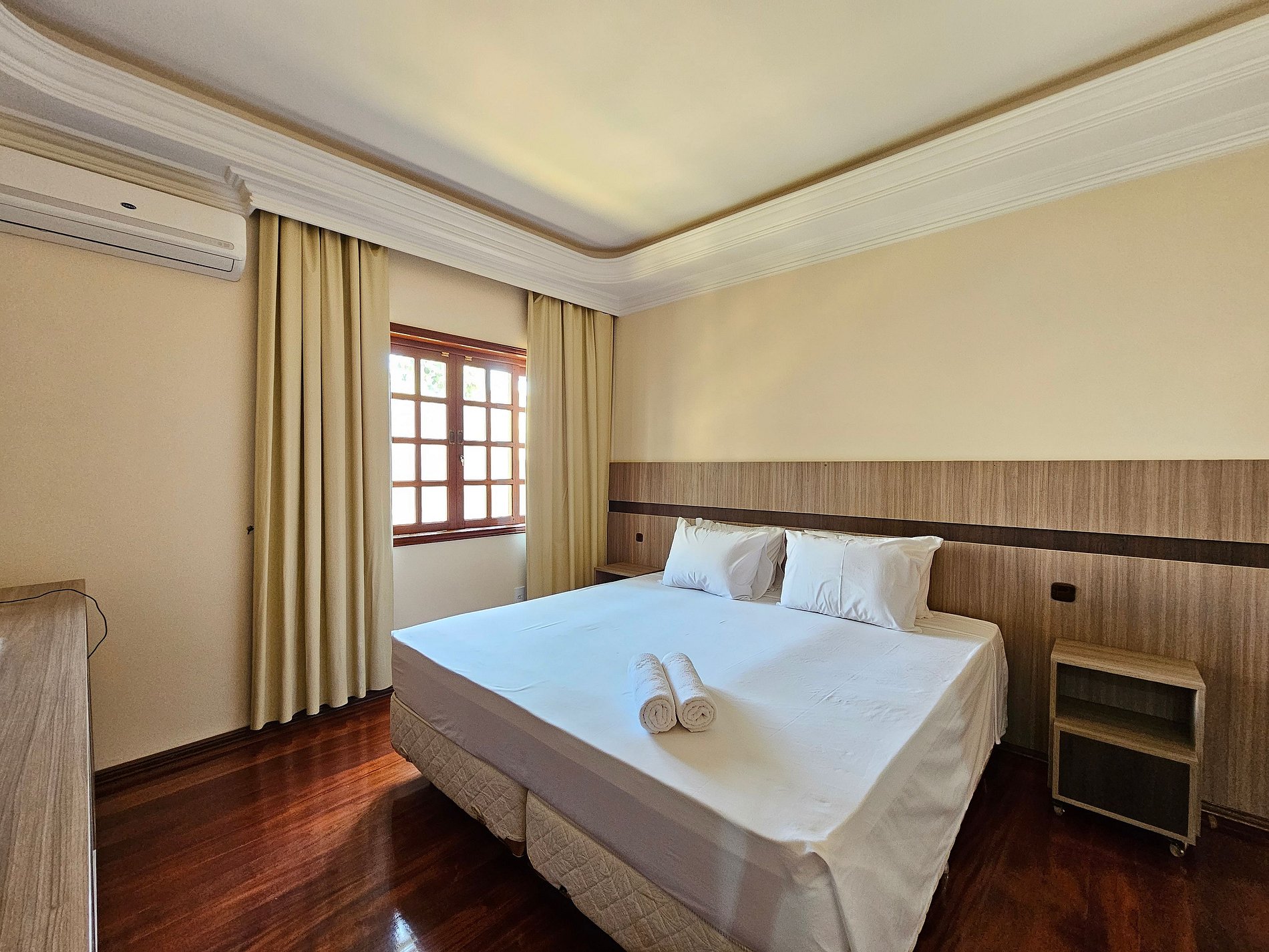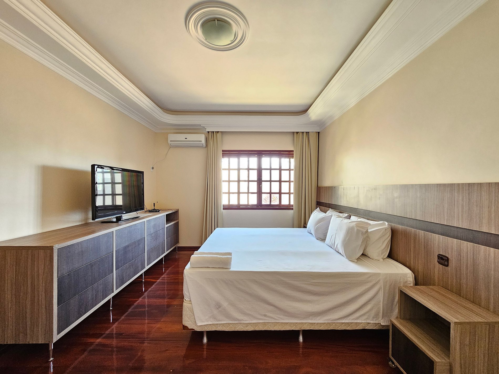 > 01 suíte com cama kingsize + 01 cama individual, com armários para roupas/pertences, TV, ar condicionado, banheiro com banheira/hidro.