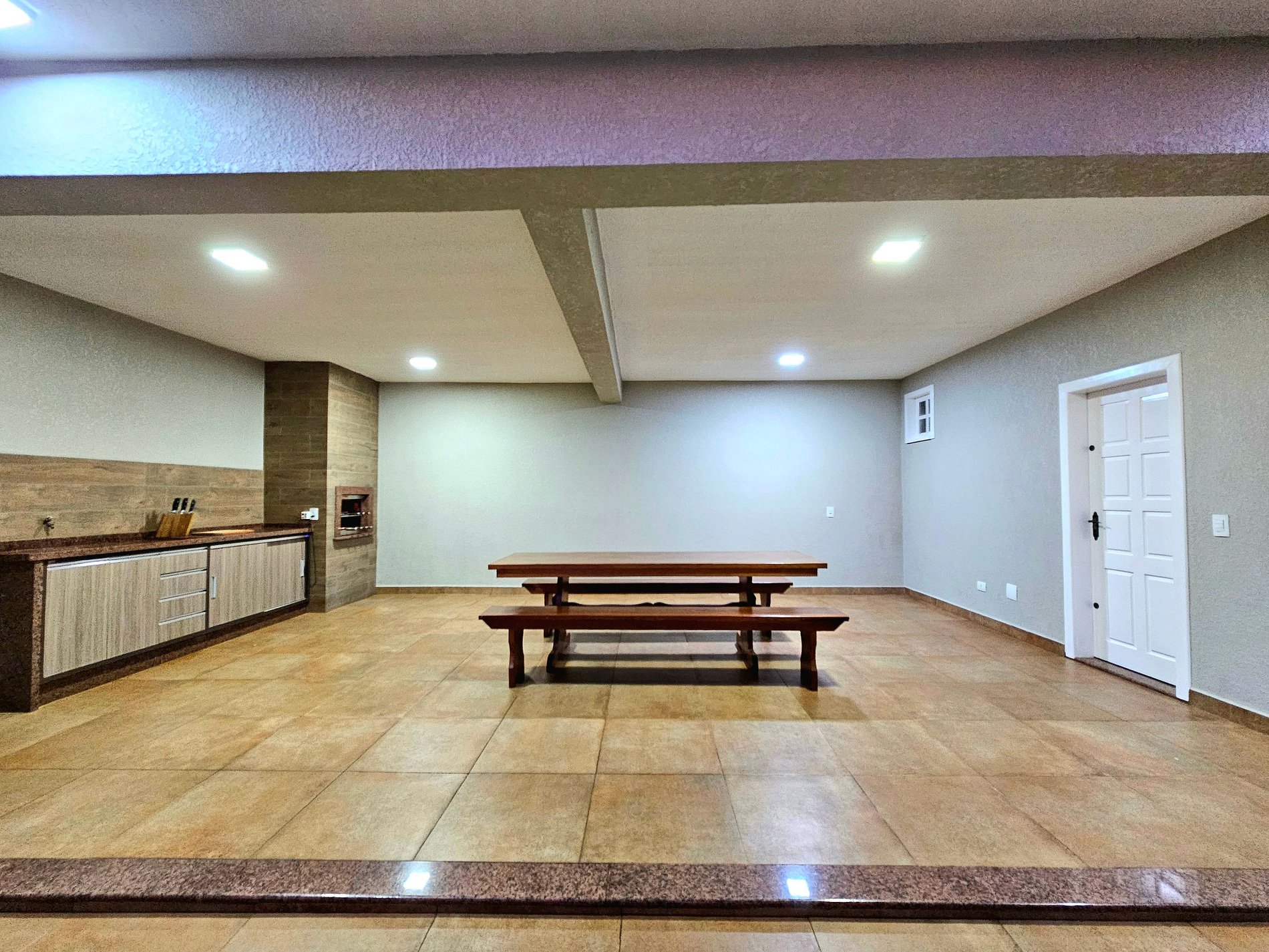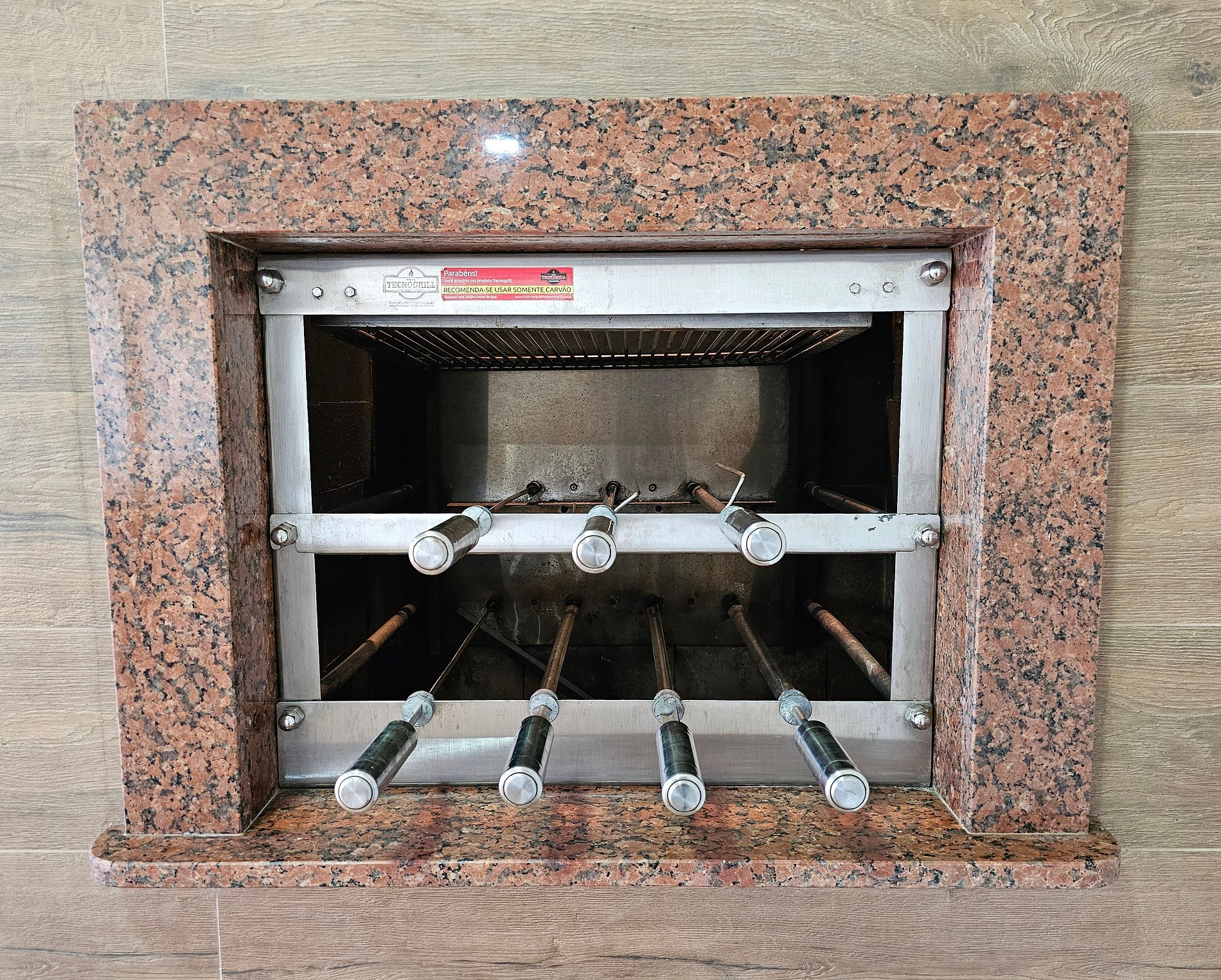 > Espaço gourmet com churrasqueira toda equipada com os utensílios para churrasco.
