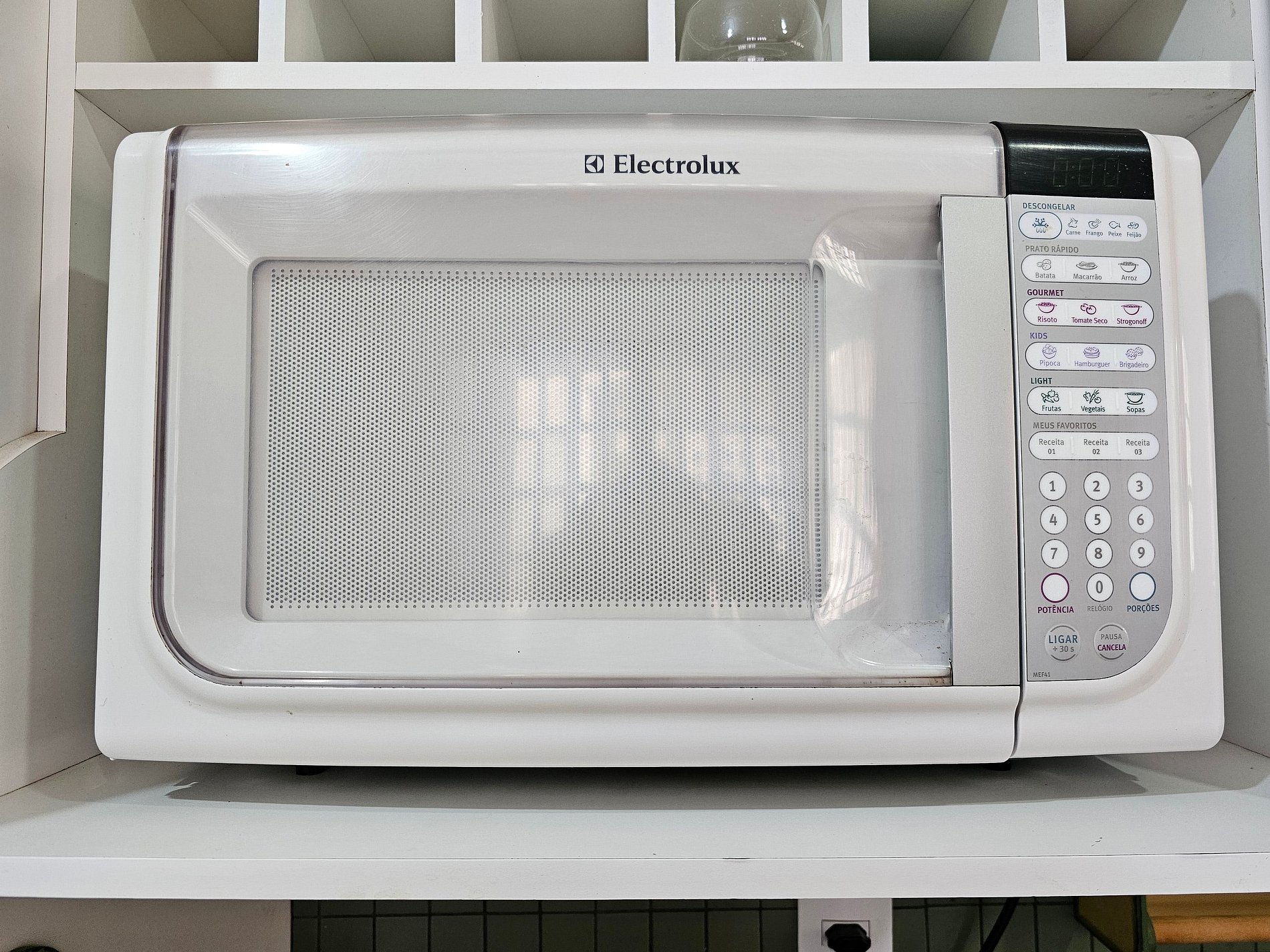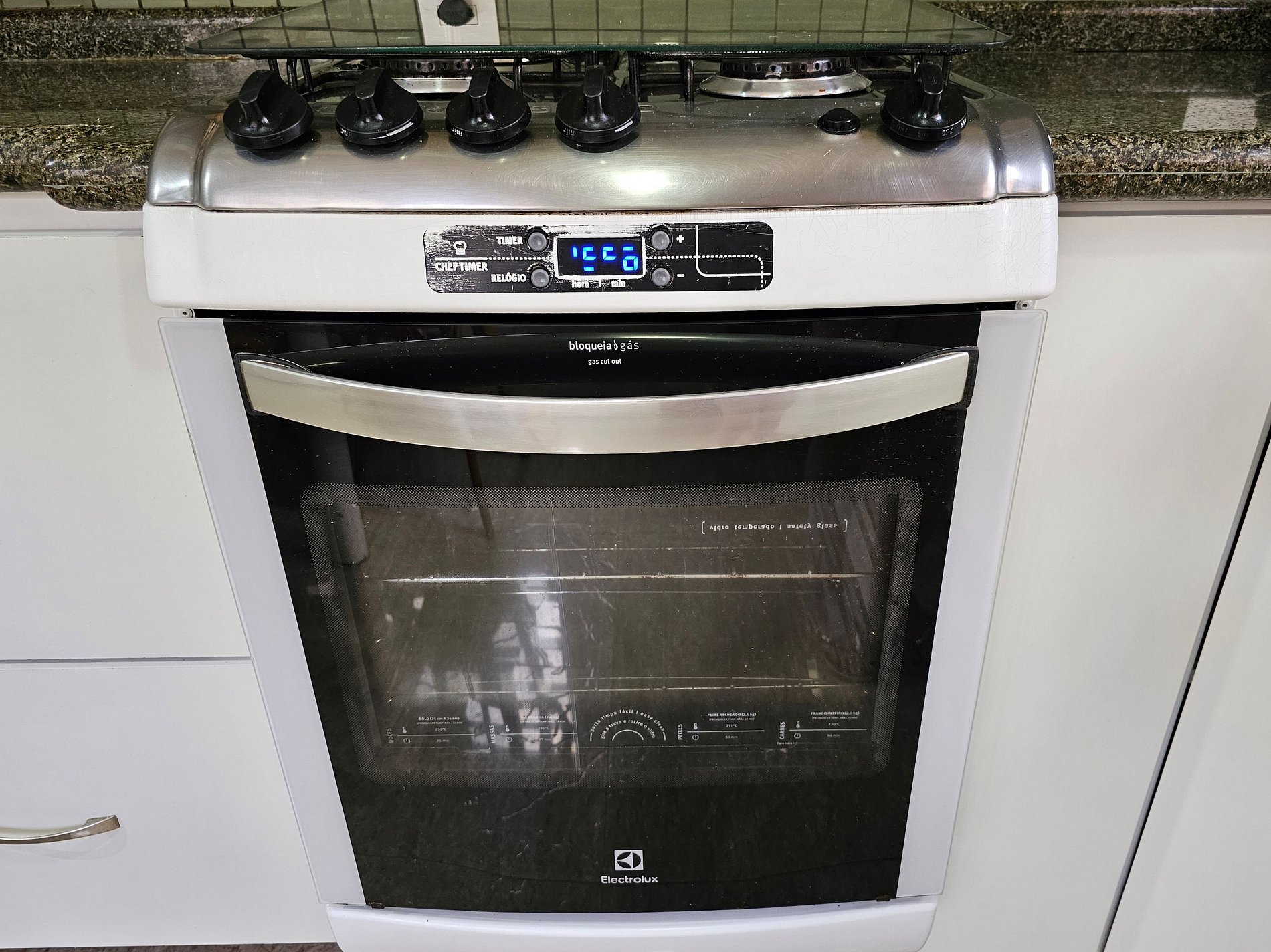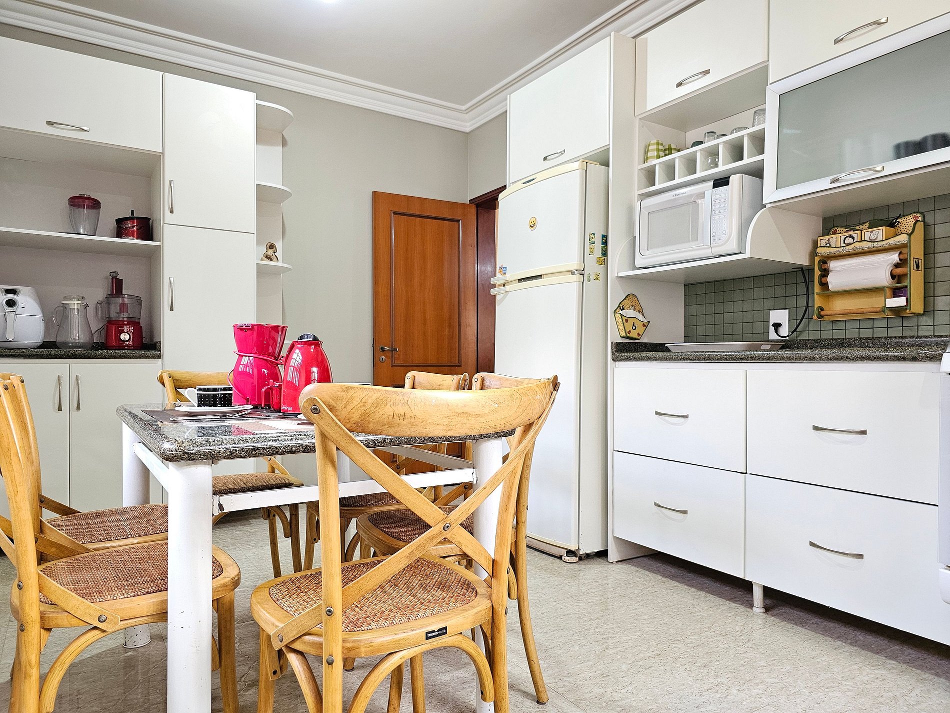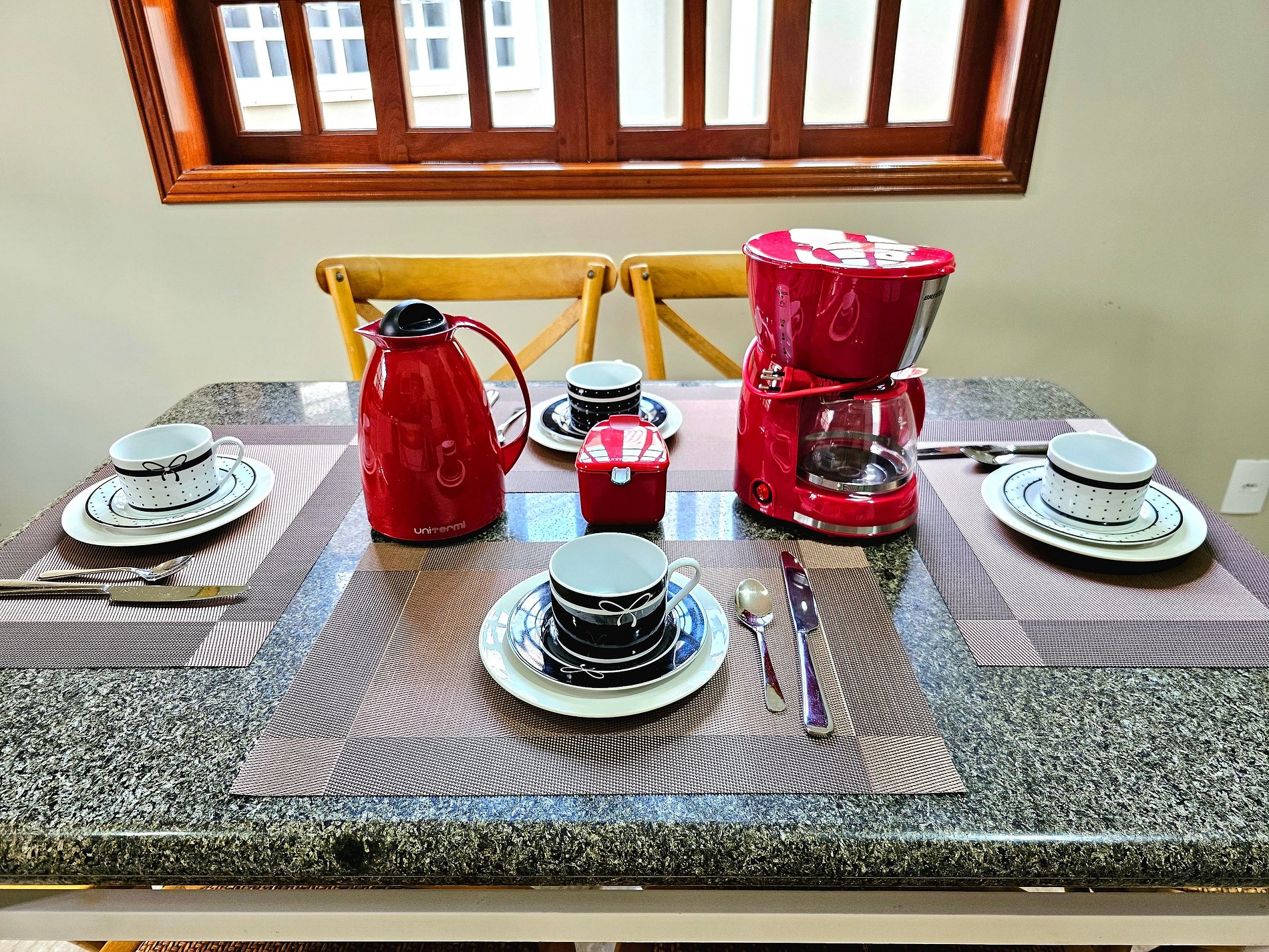 > Cozinha com todos os utensílios domésticos, todas as louças como pratos, talheres, copos, xícaras, canecas, taças e outros. Além de eletrodomésticos como: fogão, forno, micro-ondas, cafeteira elétrica, liquidificador.