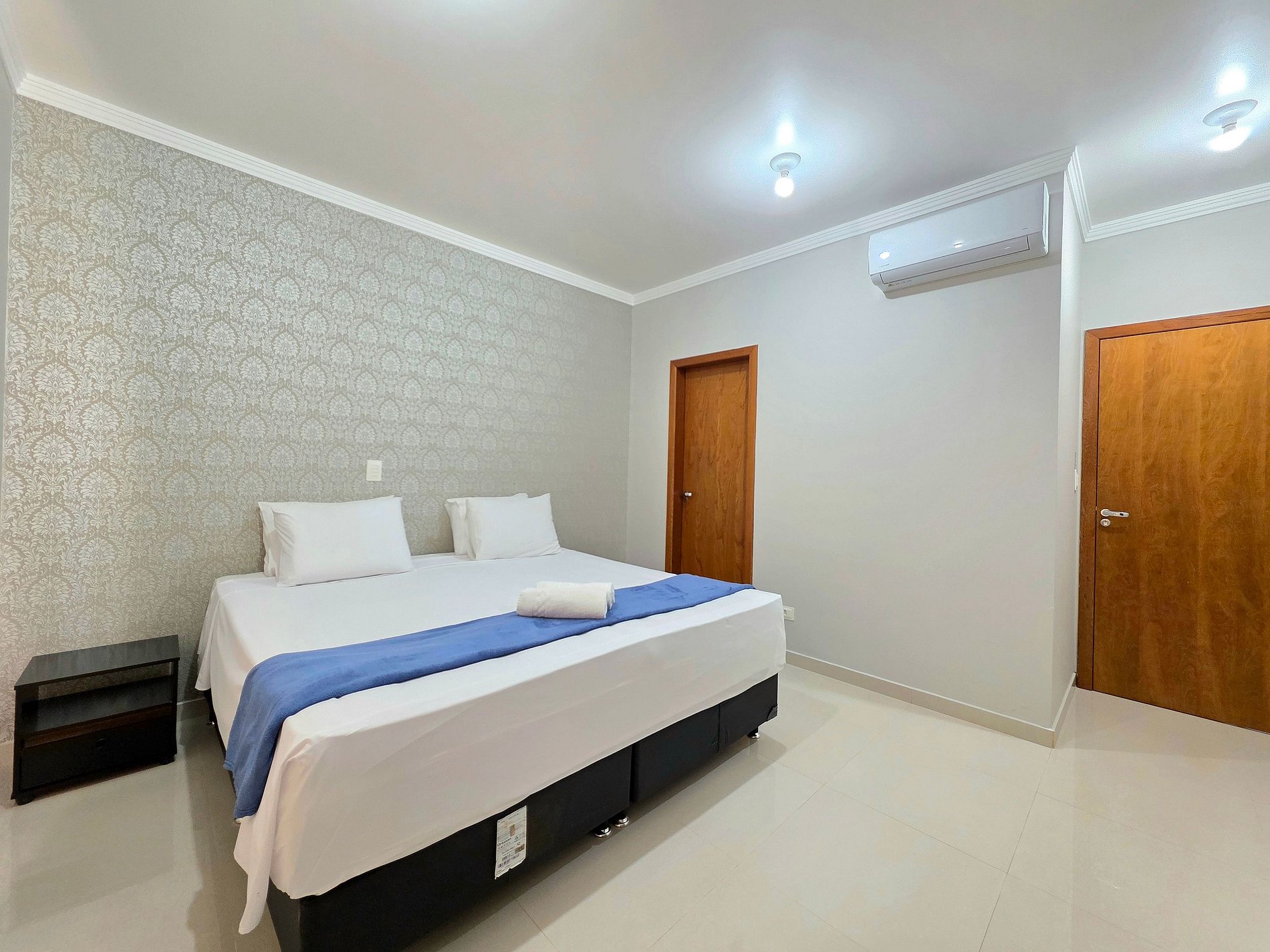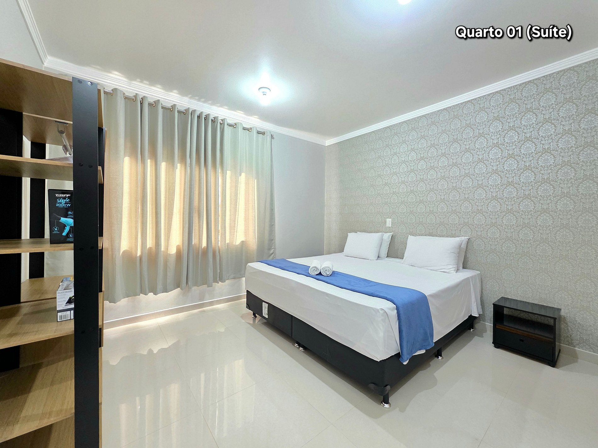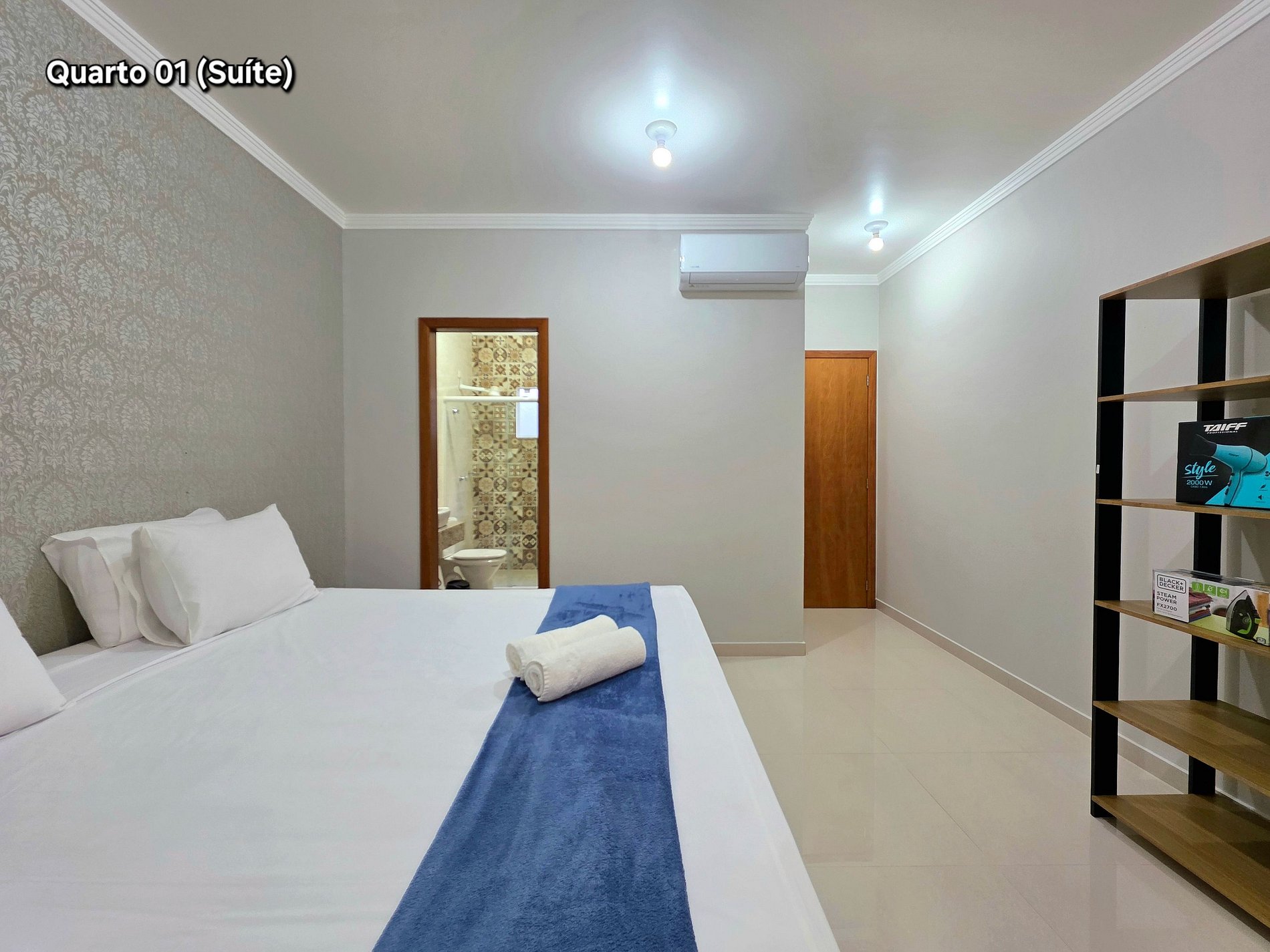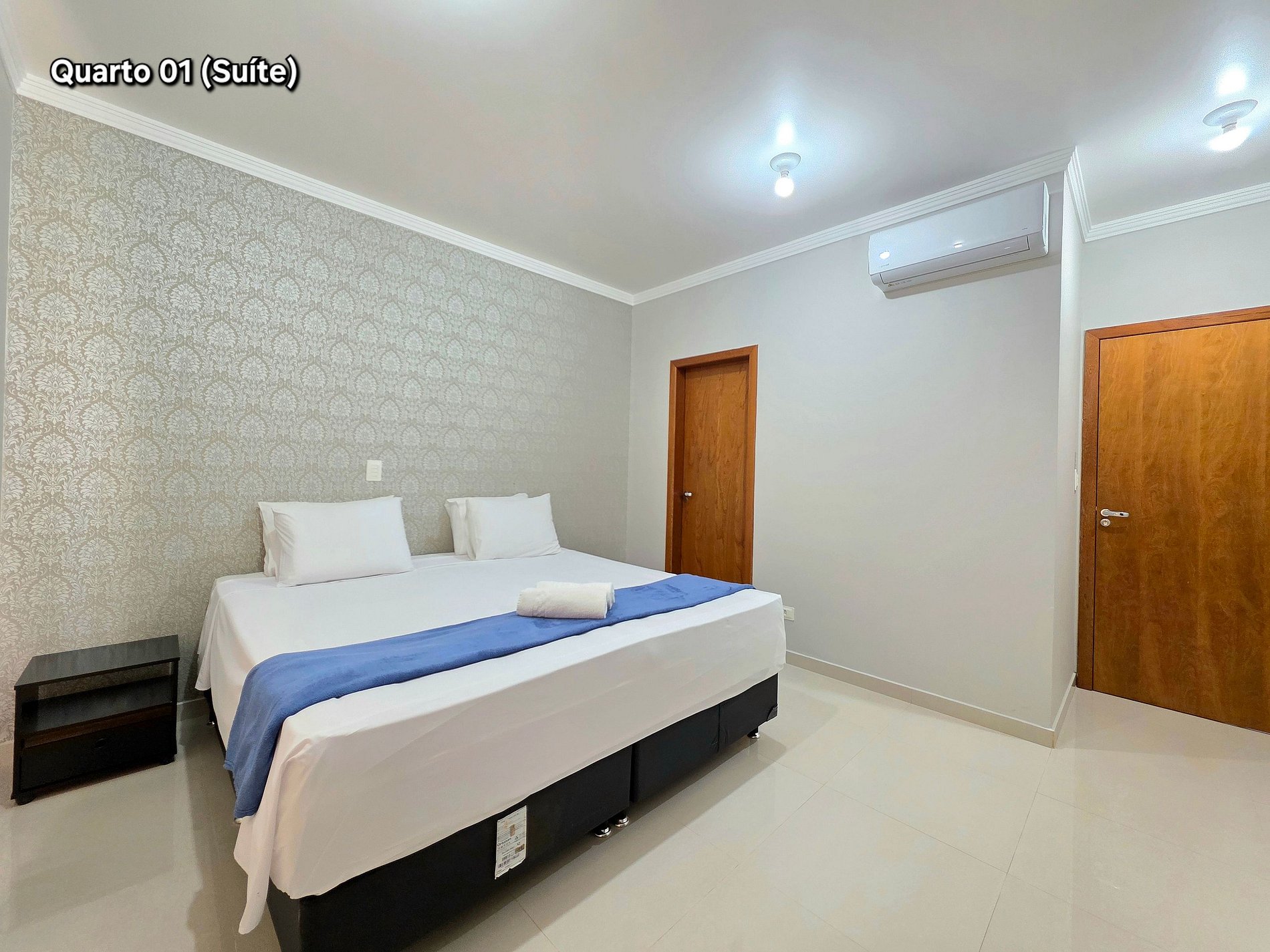 Quarto 01 (Suíte): 01 cama kingsize (com banheiro e ar condicionado)