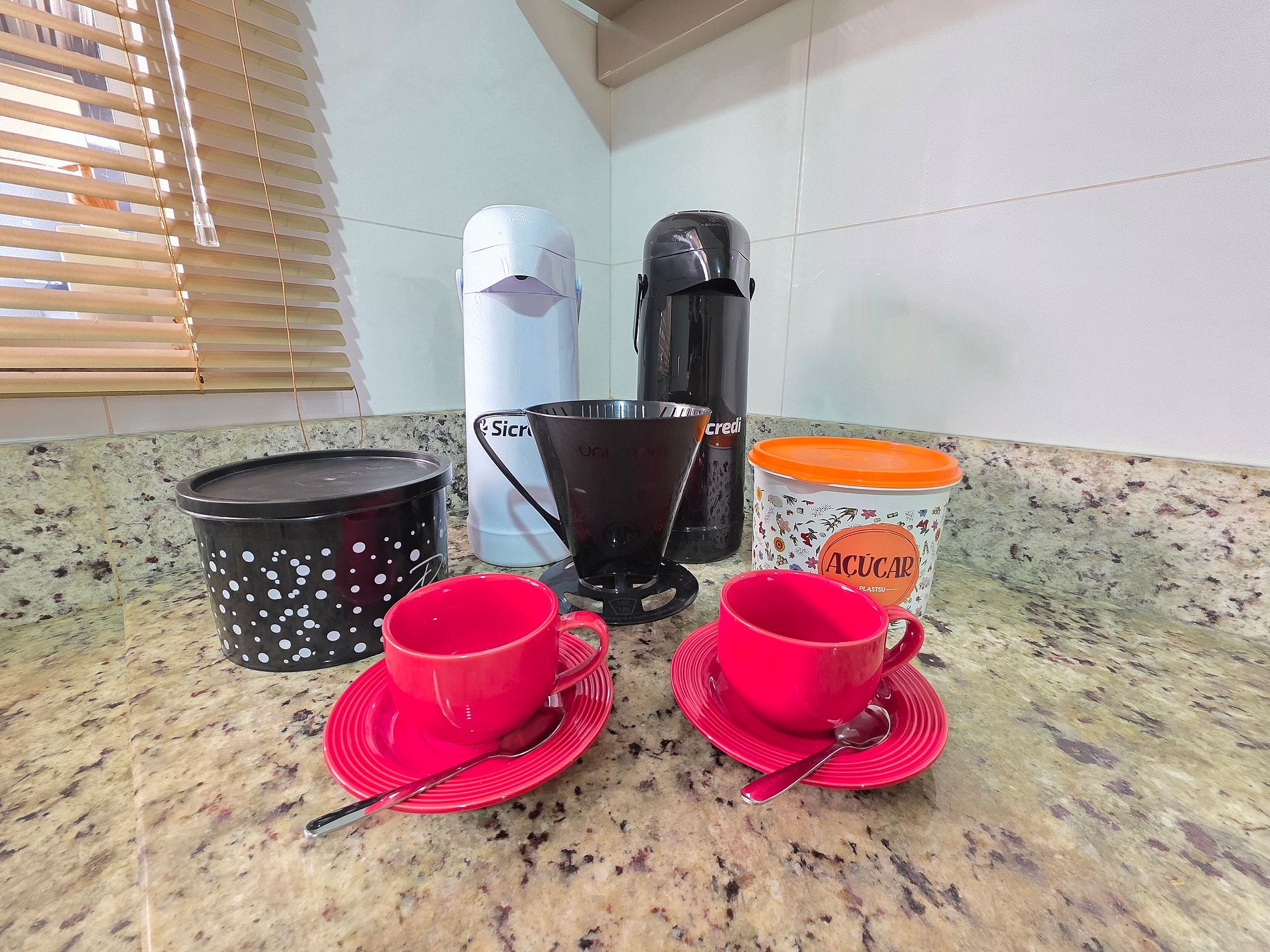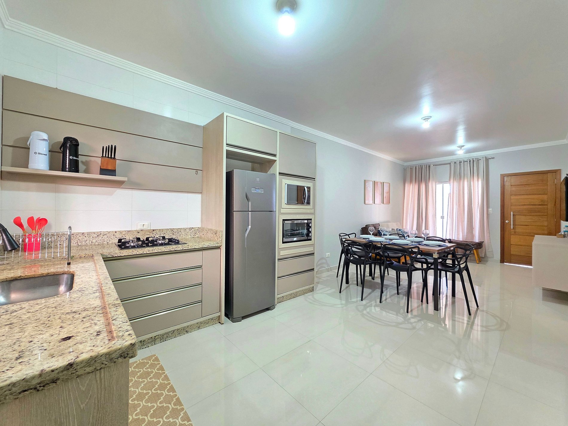 Cozinha completa com utensílios e louças para as refeições, fogão, forno, microondas, sanduicheira, liquidificador.
