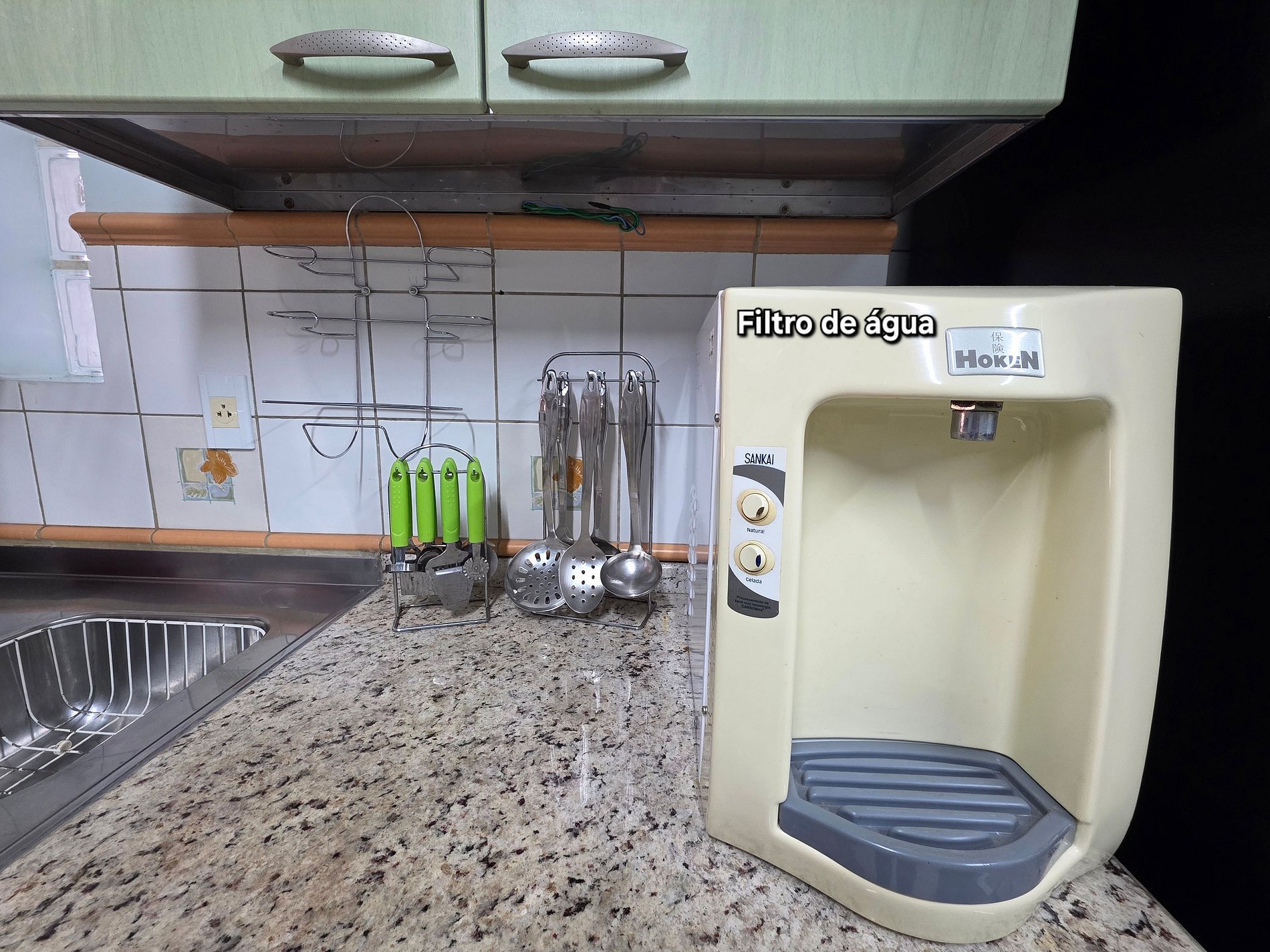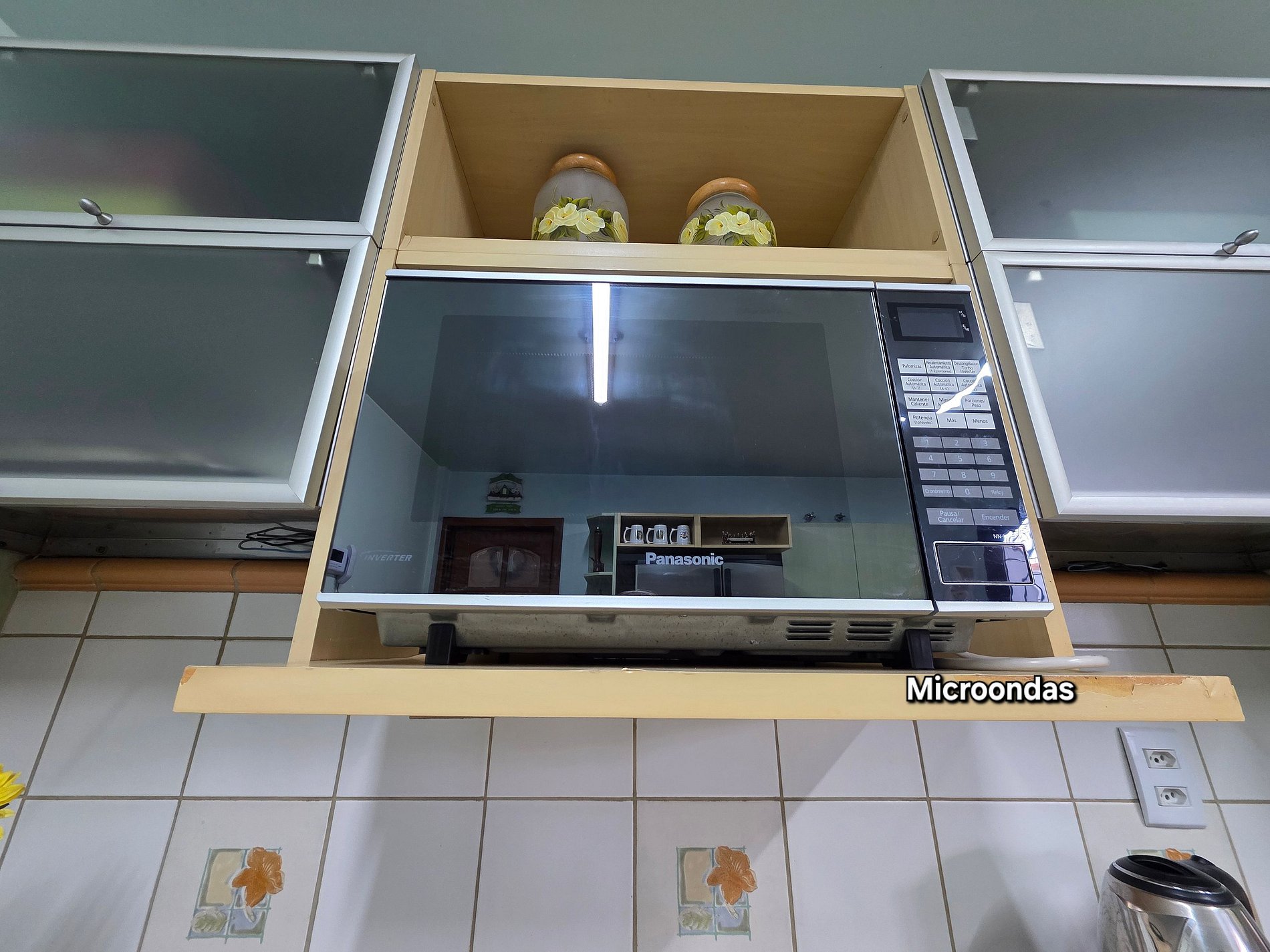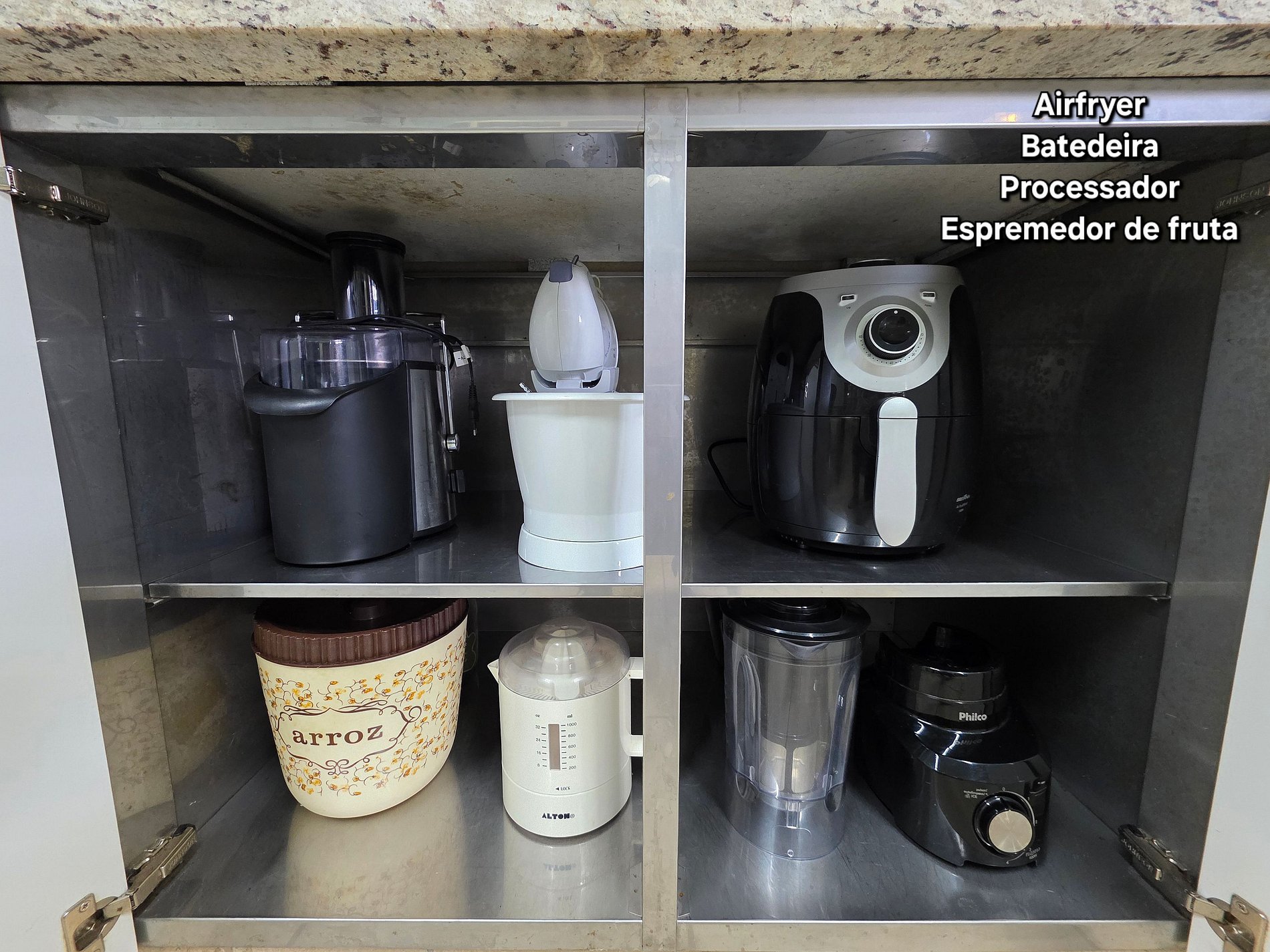 Cozinha completa com utensílios e louças para as refeições, microondas, forno, liquidificador, airfryer, espremedor de fruta, processador e batedeira.