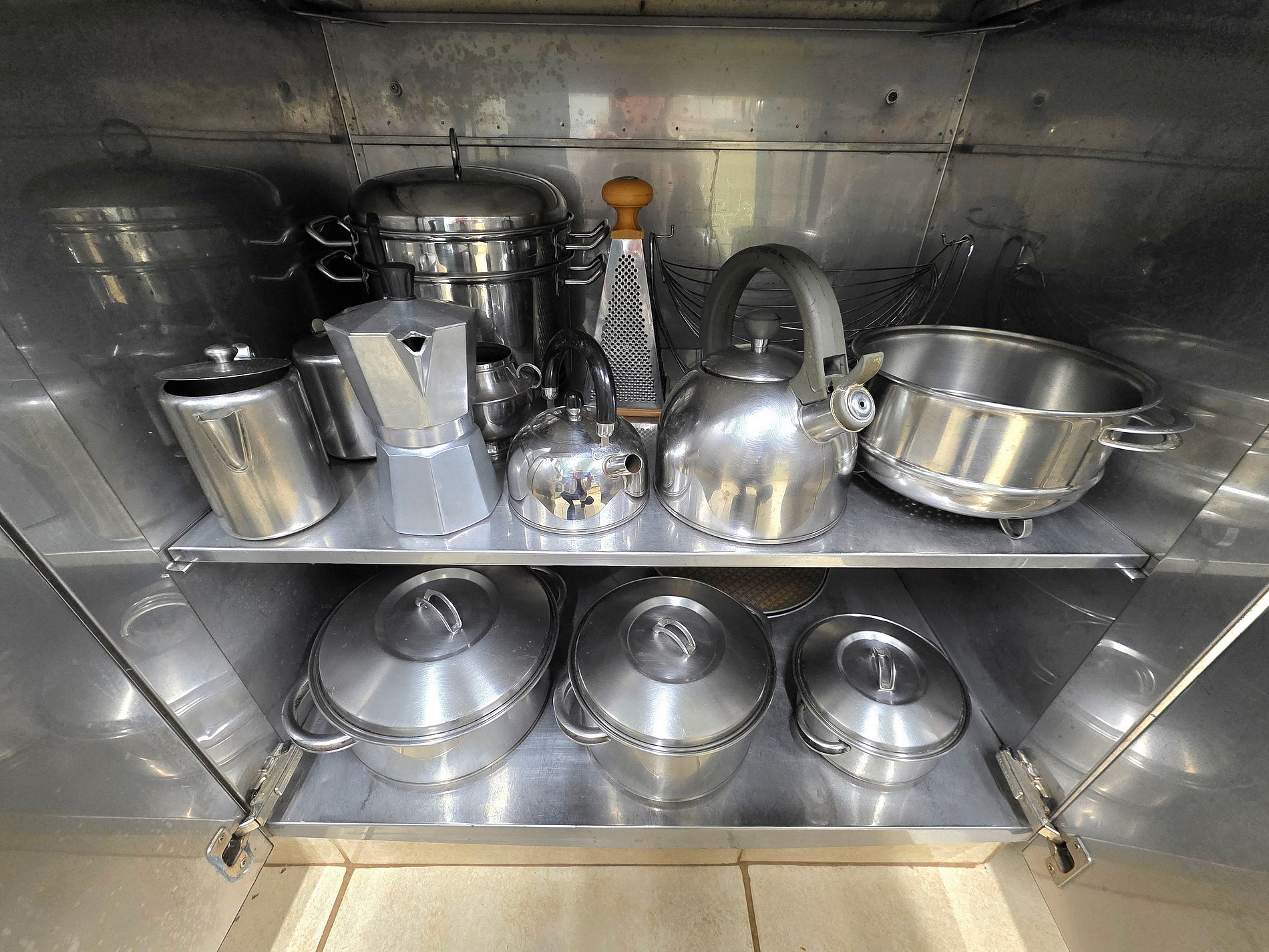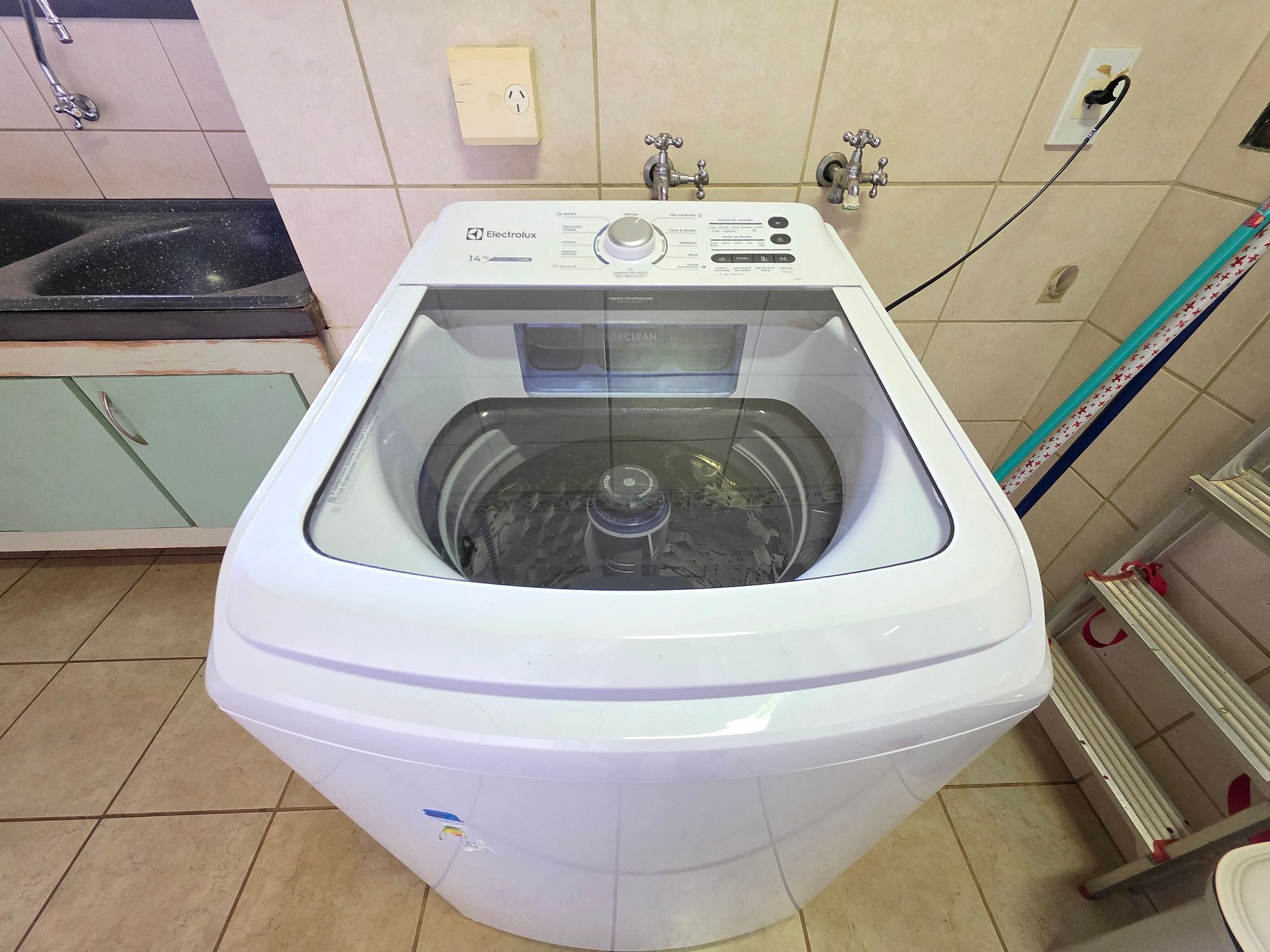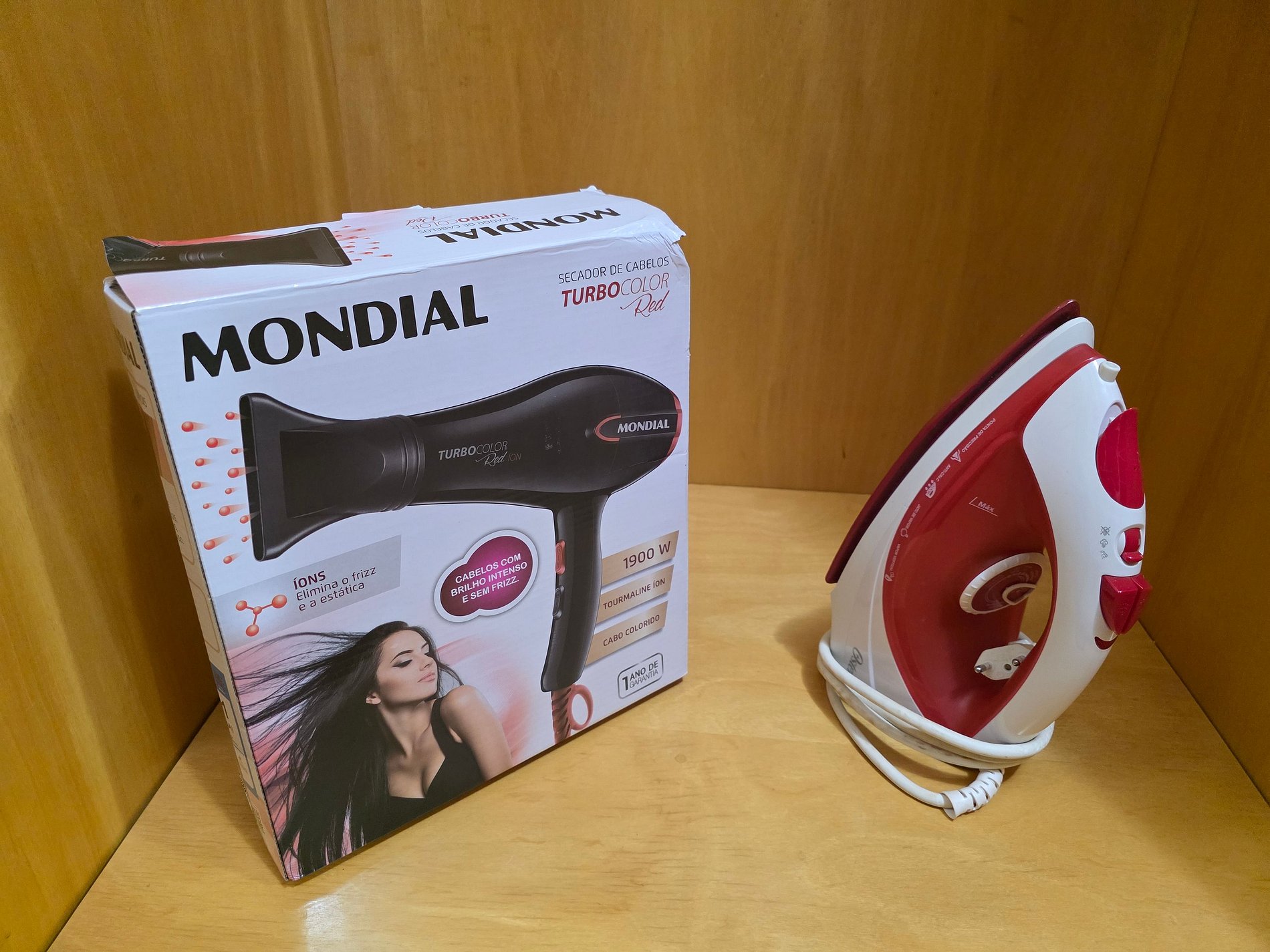Cozinha completa com utensílios e louças para as refeições, microondas, forno, liquidificador, airfryer, espremedor de fruta, processador e batedeira.
