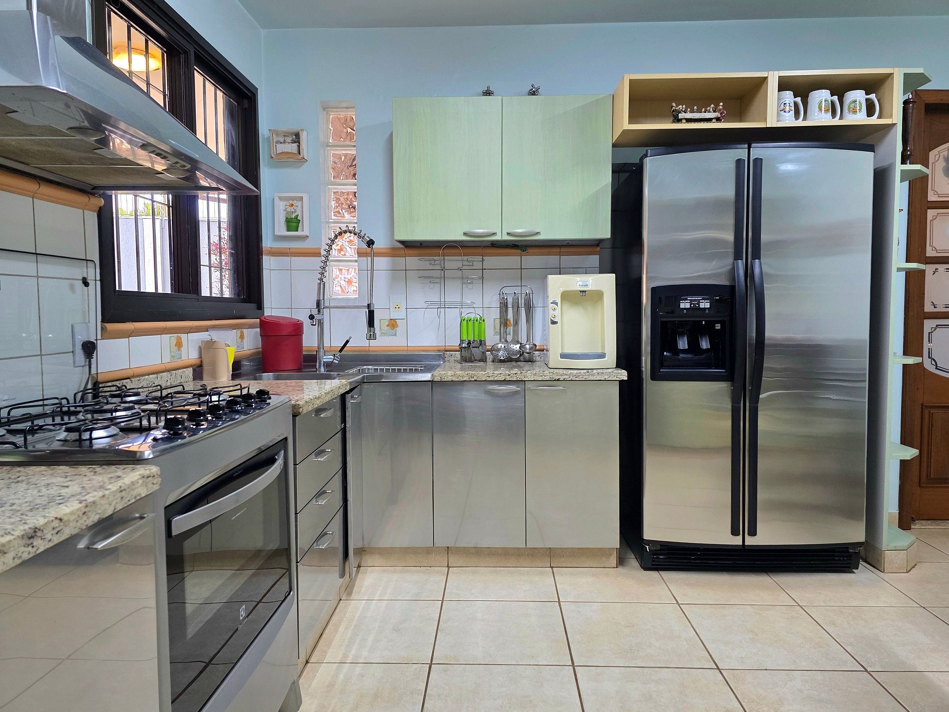 Cozinha completa com utensílios e louças para as refeições, microondas, forno, liquidificador, airfryer, espremedor de fruta, processador e batedeira.
