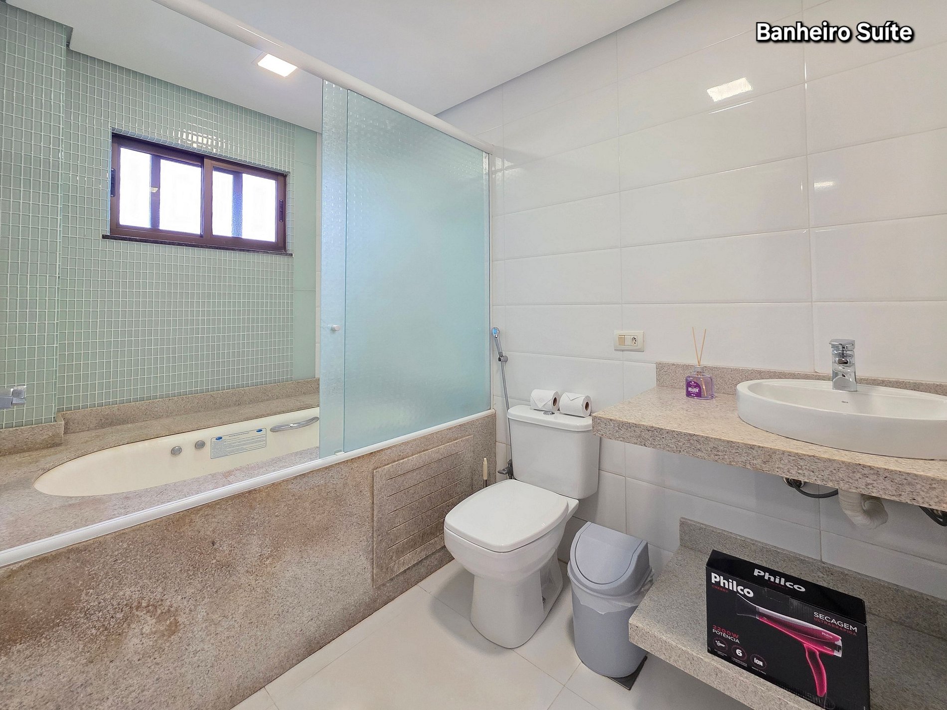 Quarto 01: Suíte com 01 cama kingsize (banheiro com banheira, ar condicionado quente/frio, sacada)