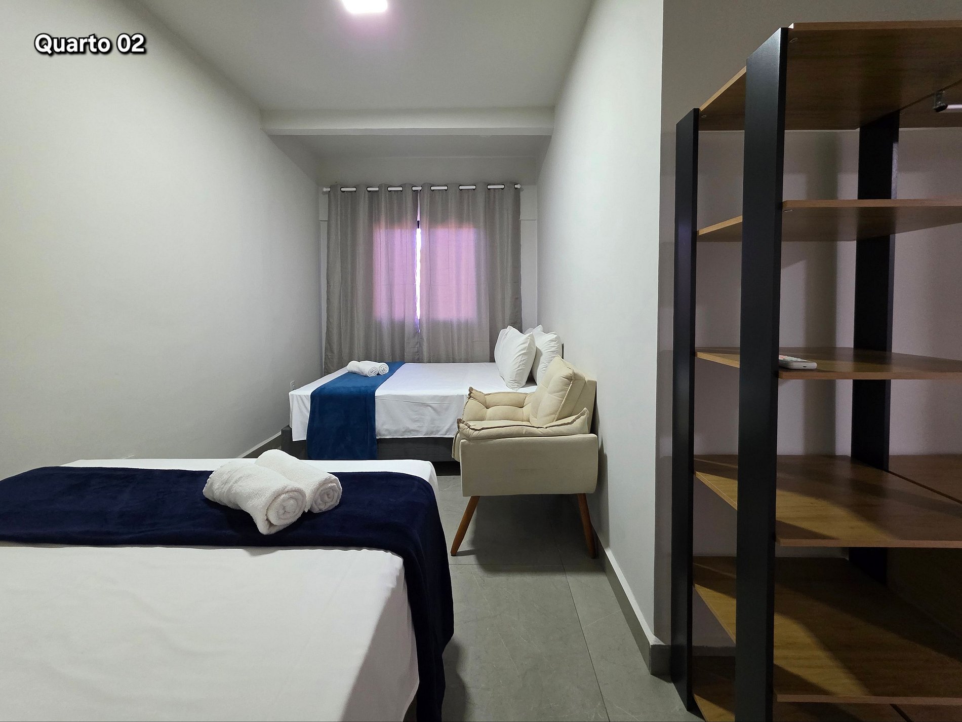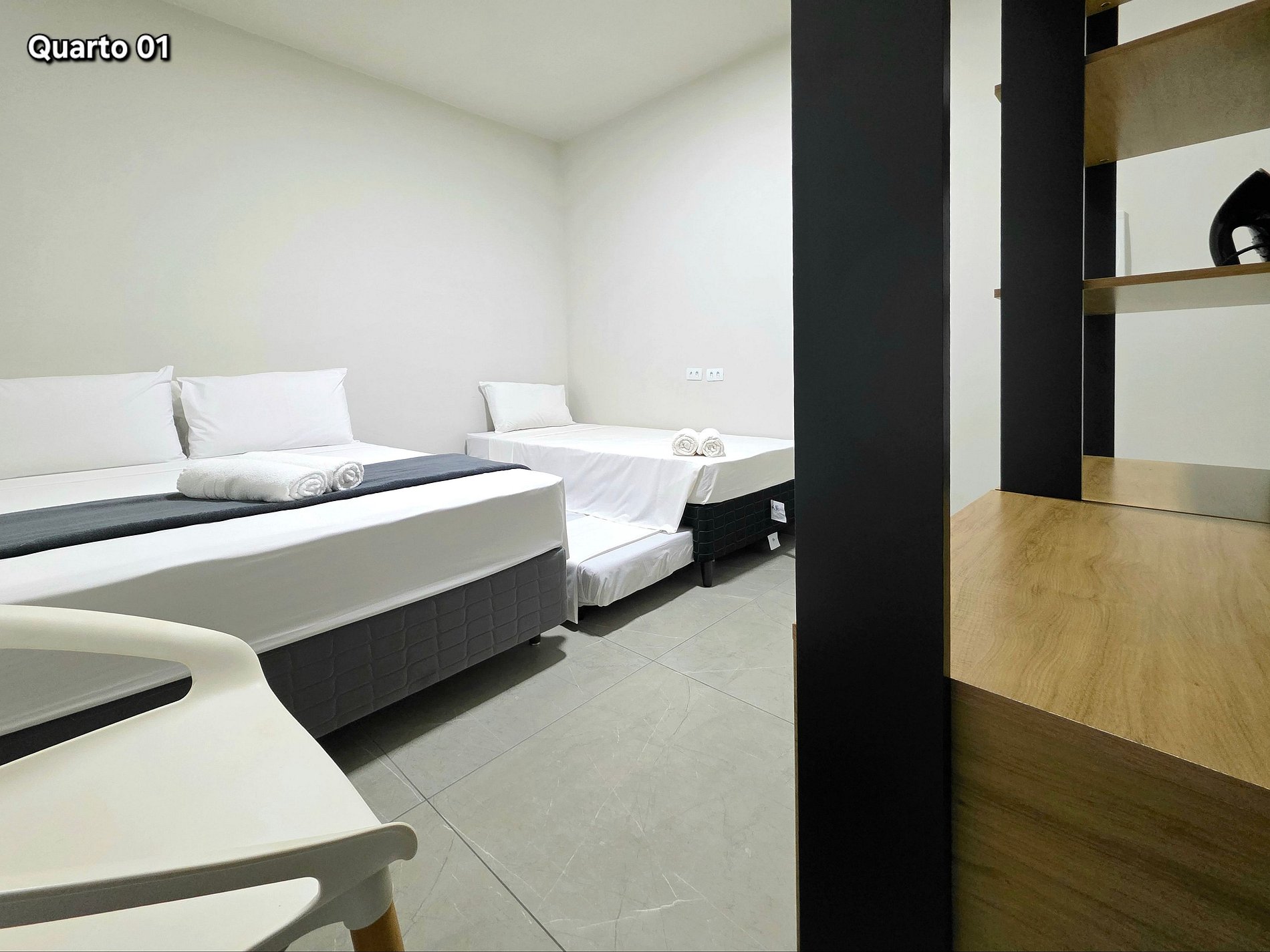 Quarto 01: 01 cama de casal + 01 cama de solteiro com ar condicionado quente/frio.