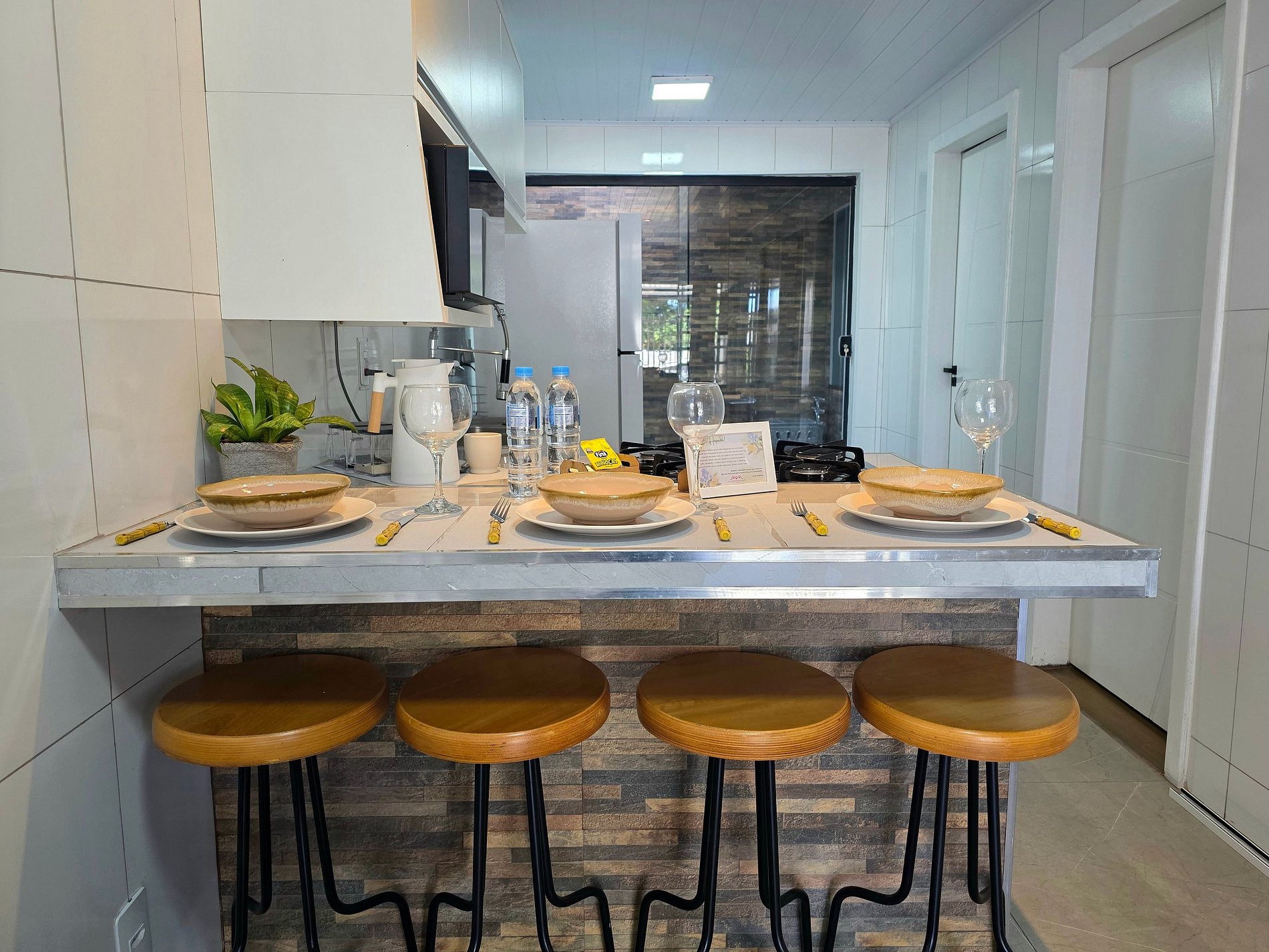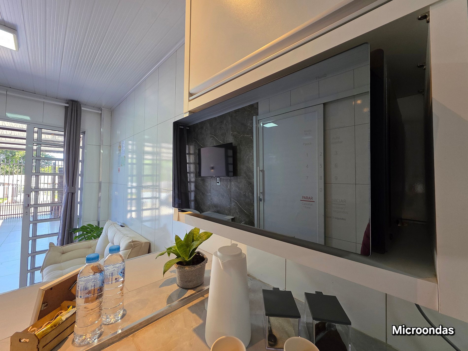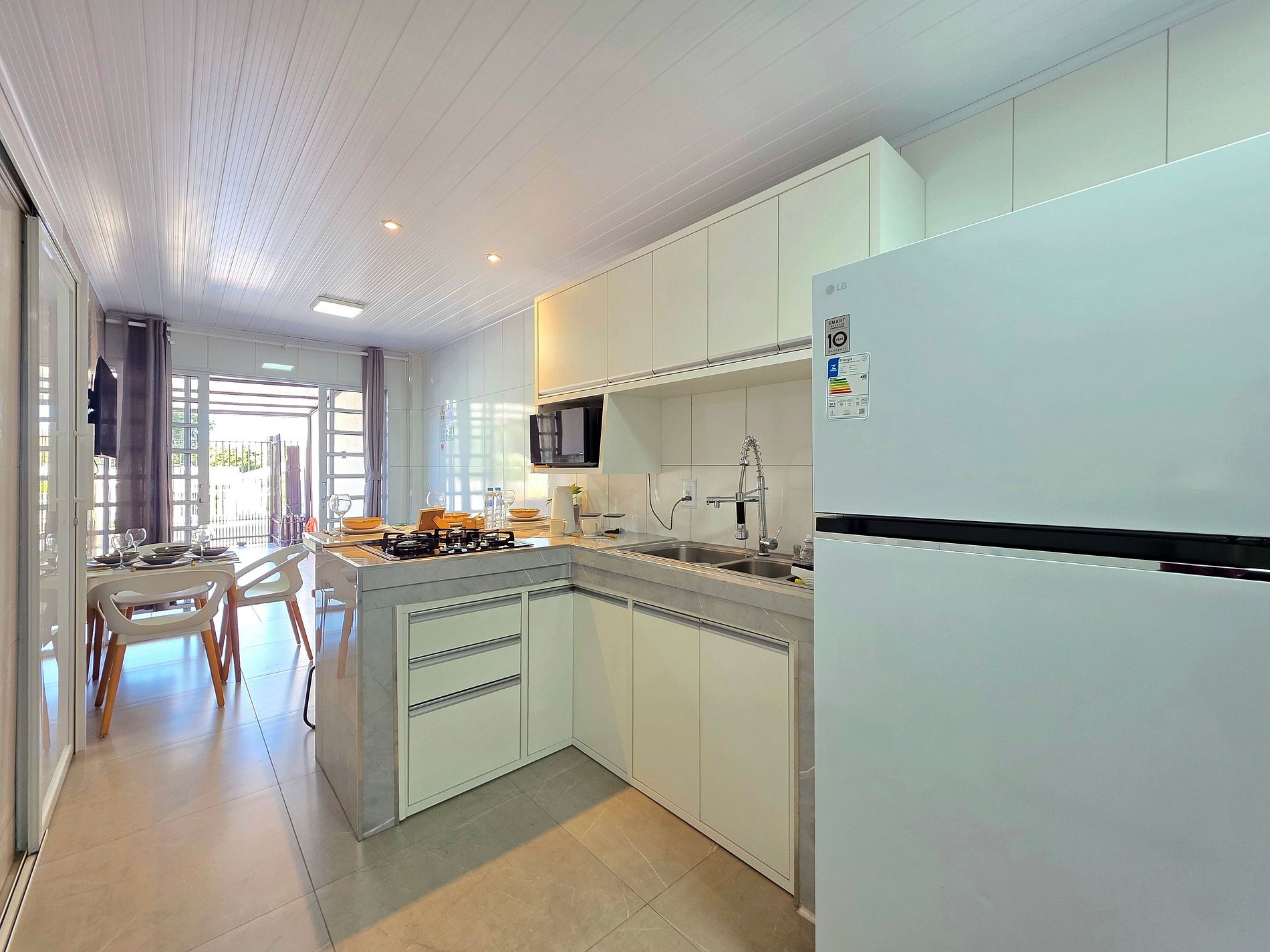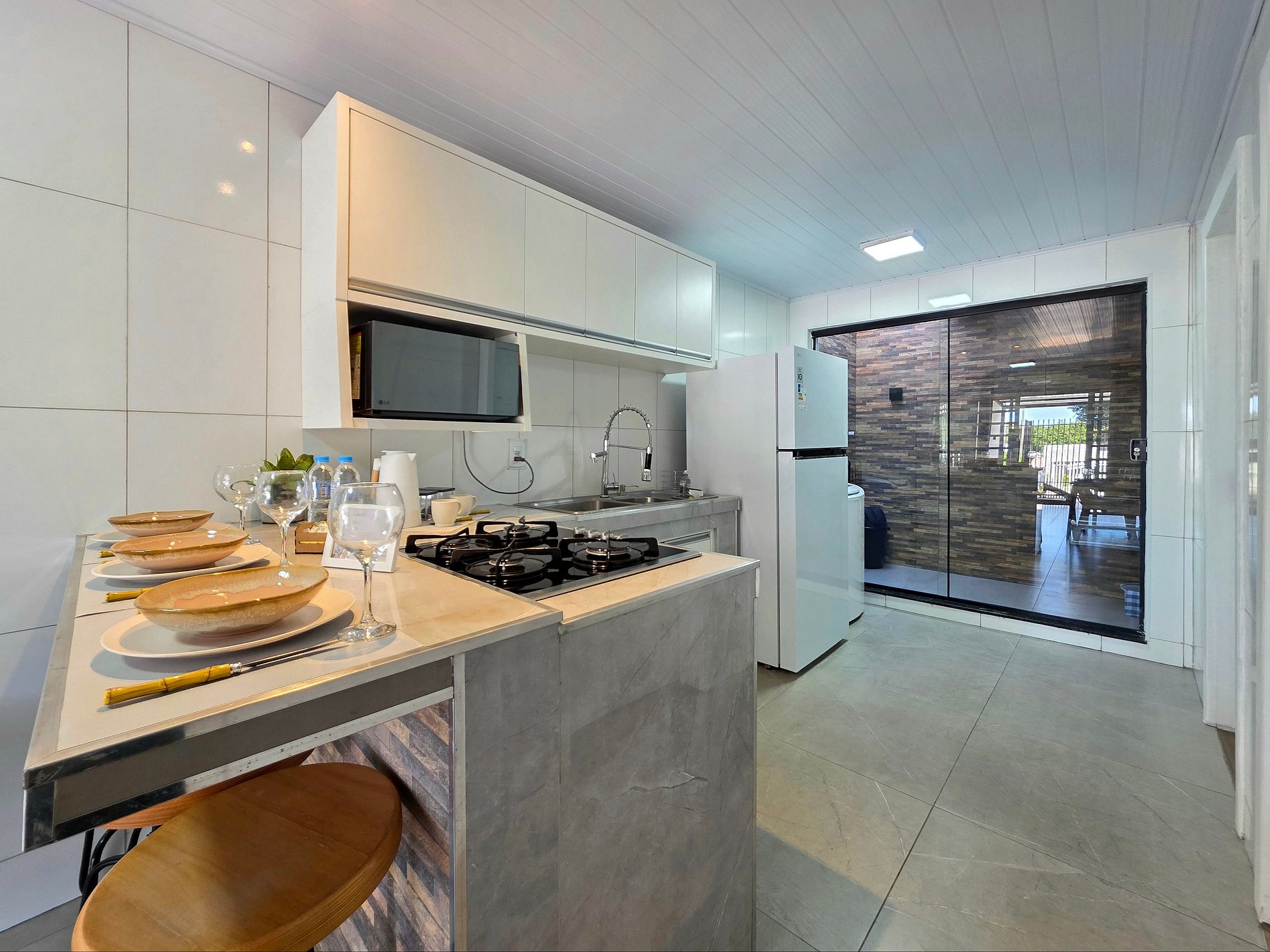 Cozinha completa com utensílios e louças para as refeições, fogão, microondas, sanduicheira, liquidificador.