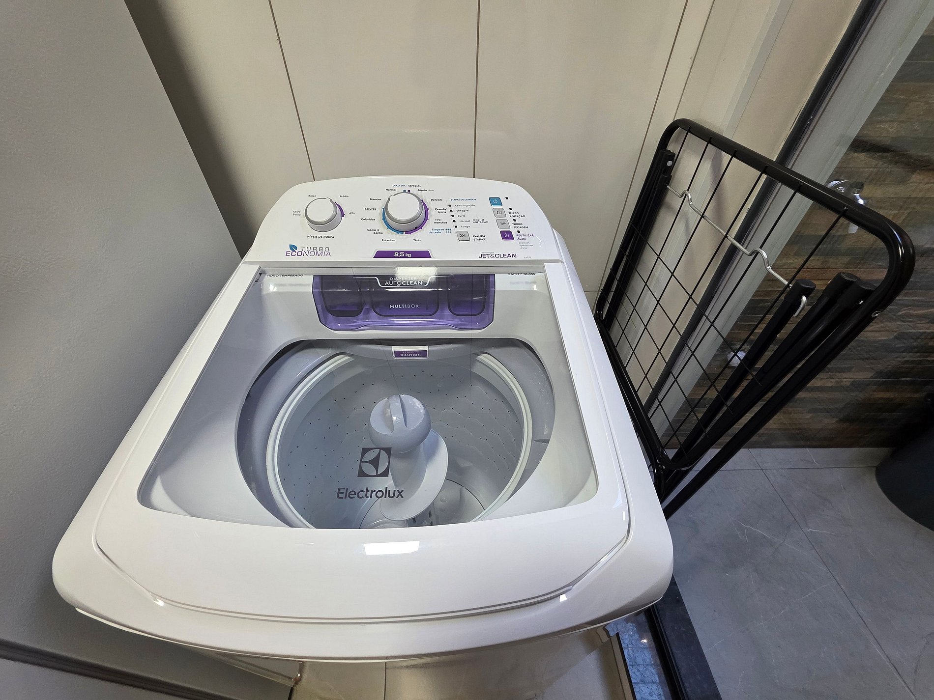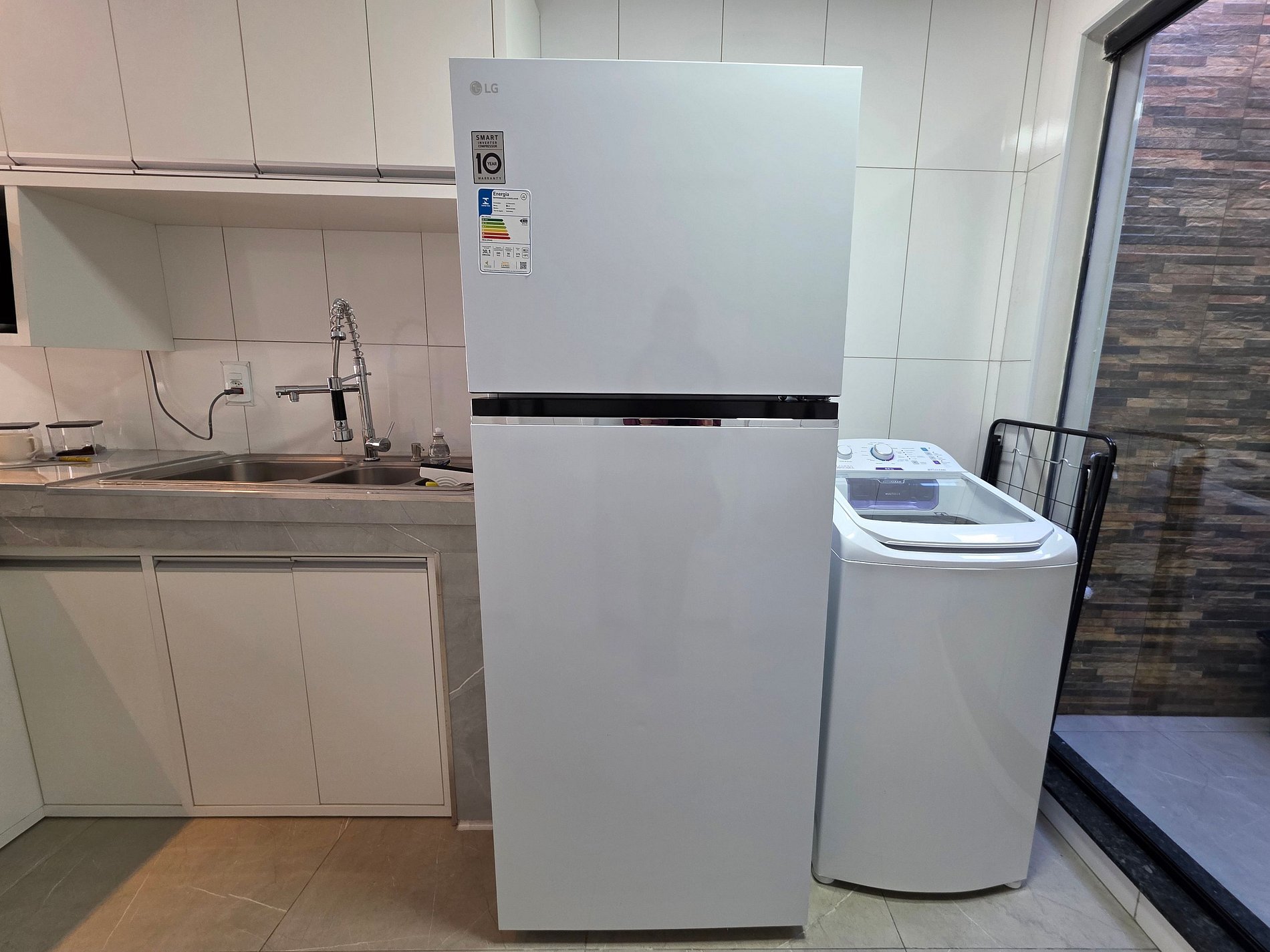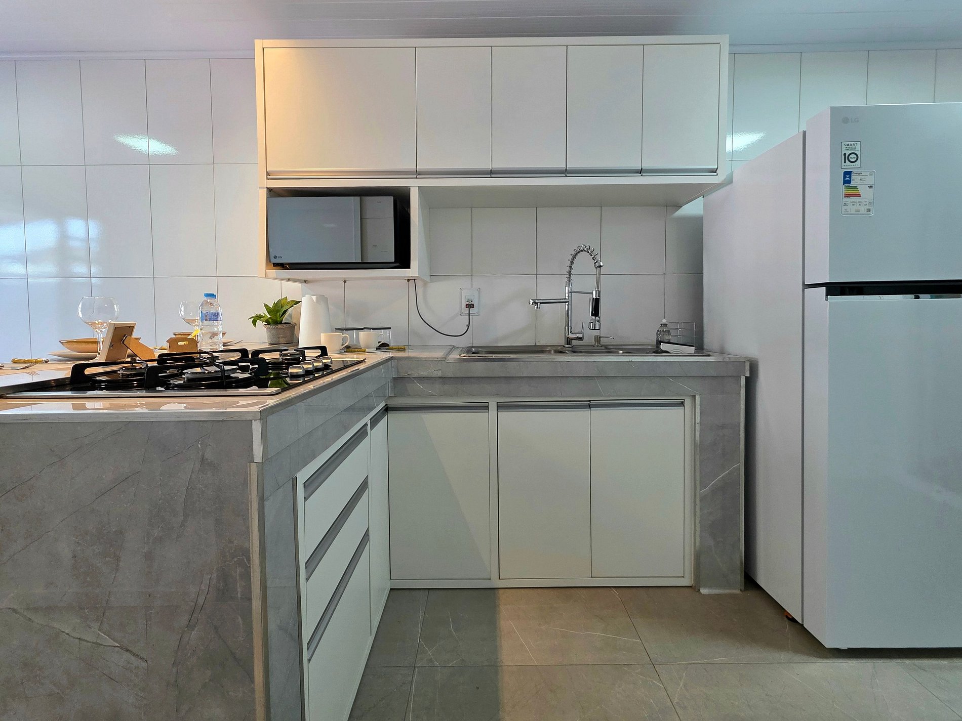 Cozinha completa com utensílios e louças para as refeições, fogão, microondas, sanduicheira, liquidificador.