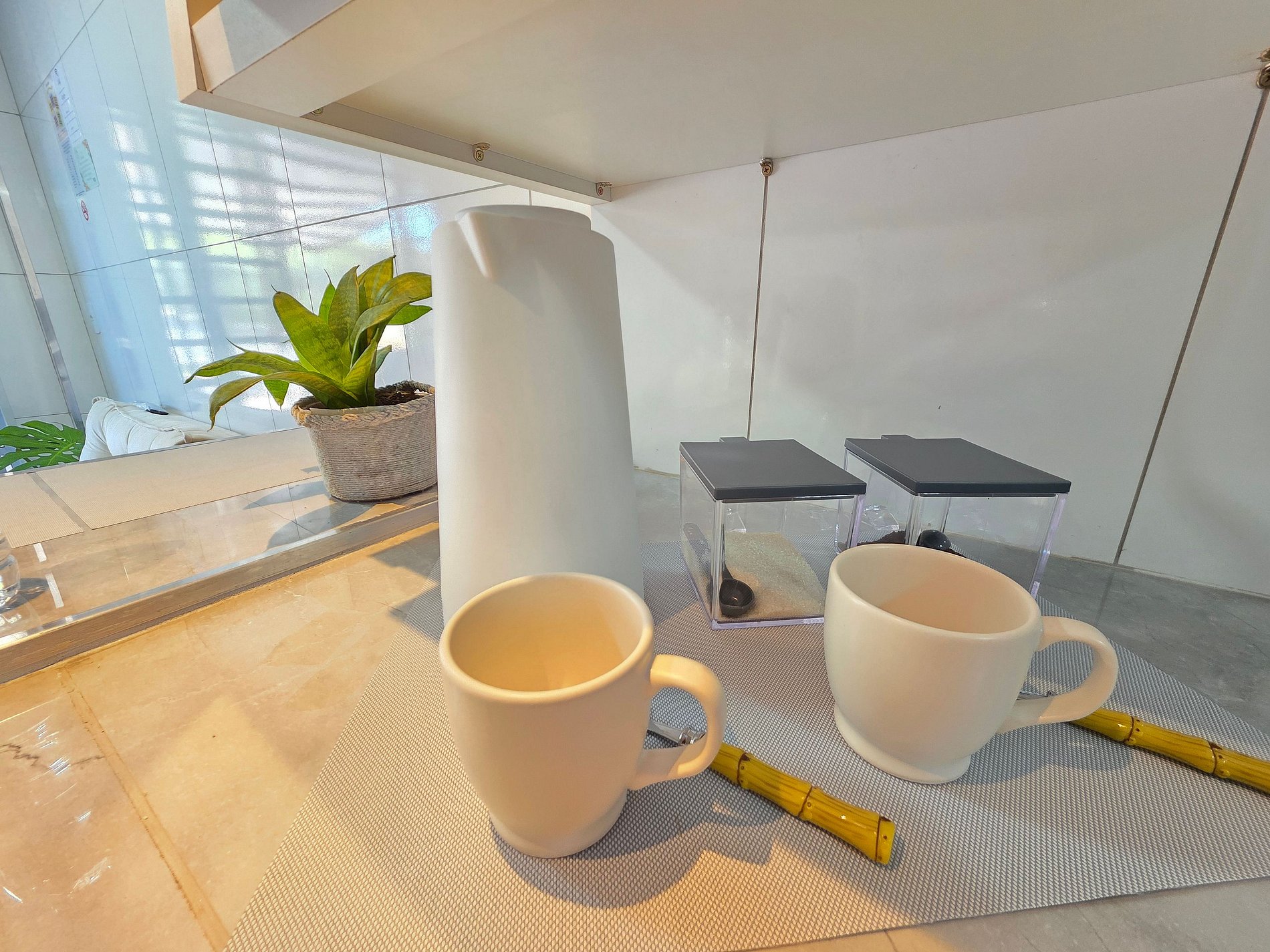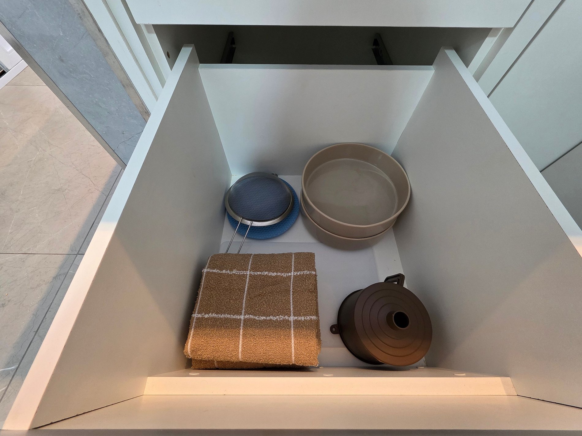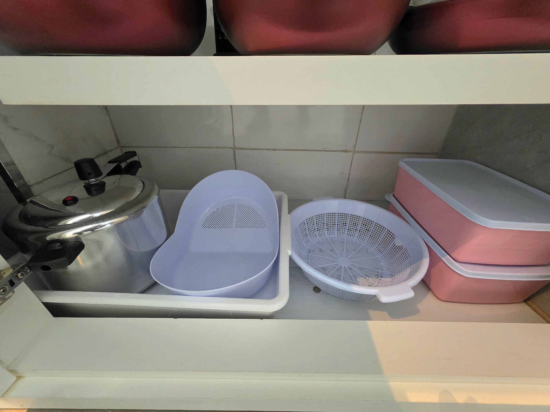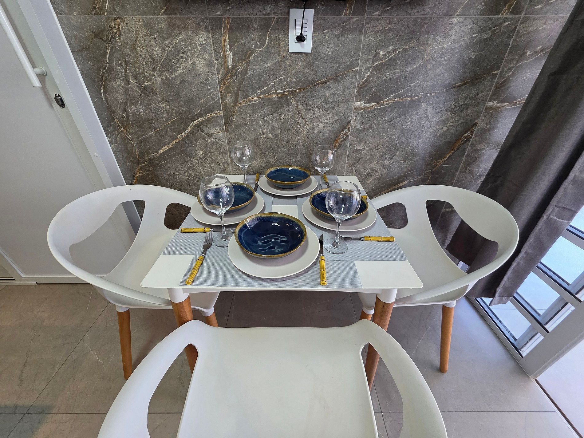 Cozinha completa com utensílios e louças para as refeições, fogão, microondas, sanduicheira, liquidificador.