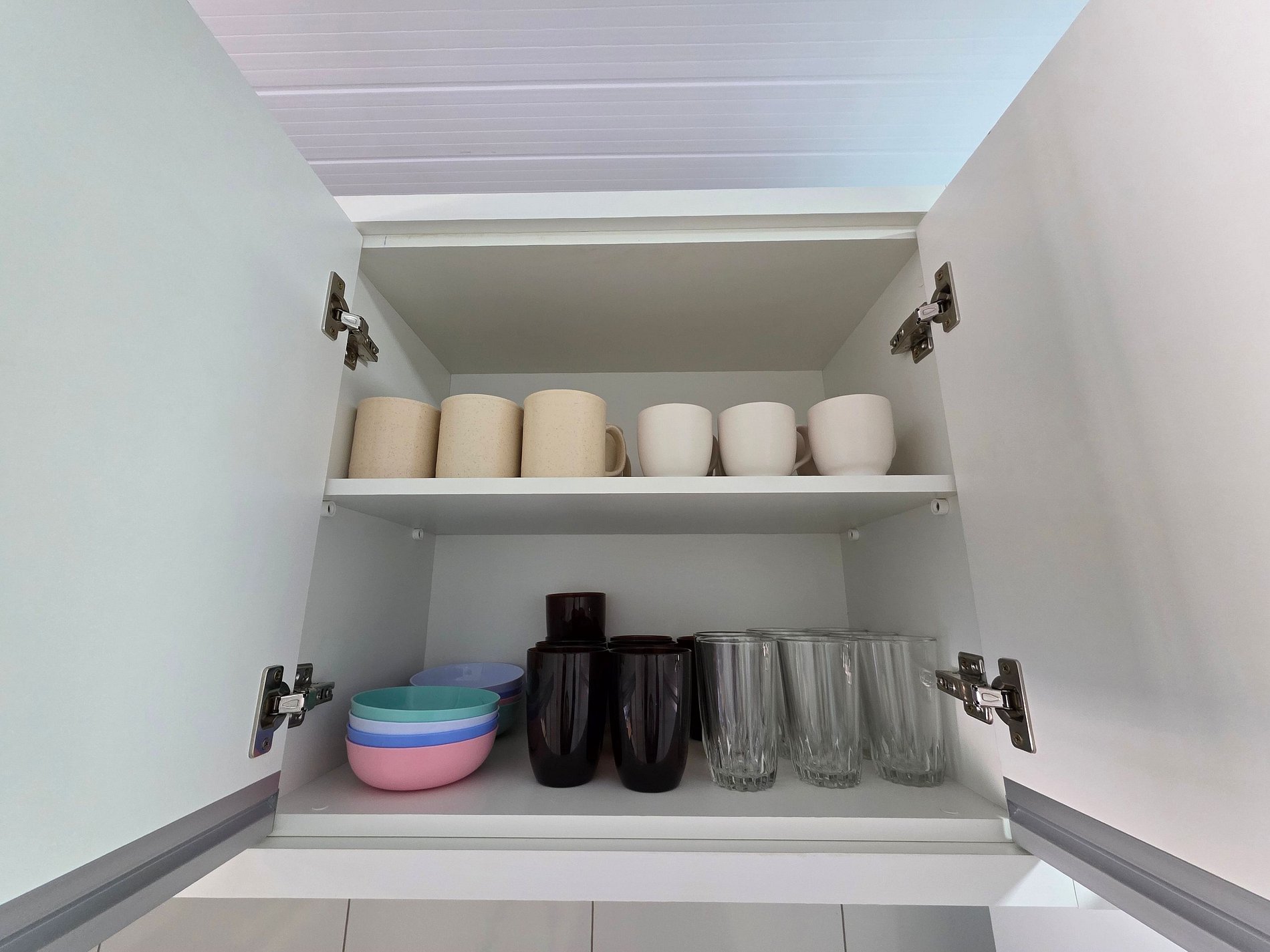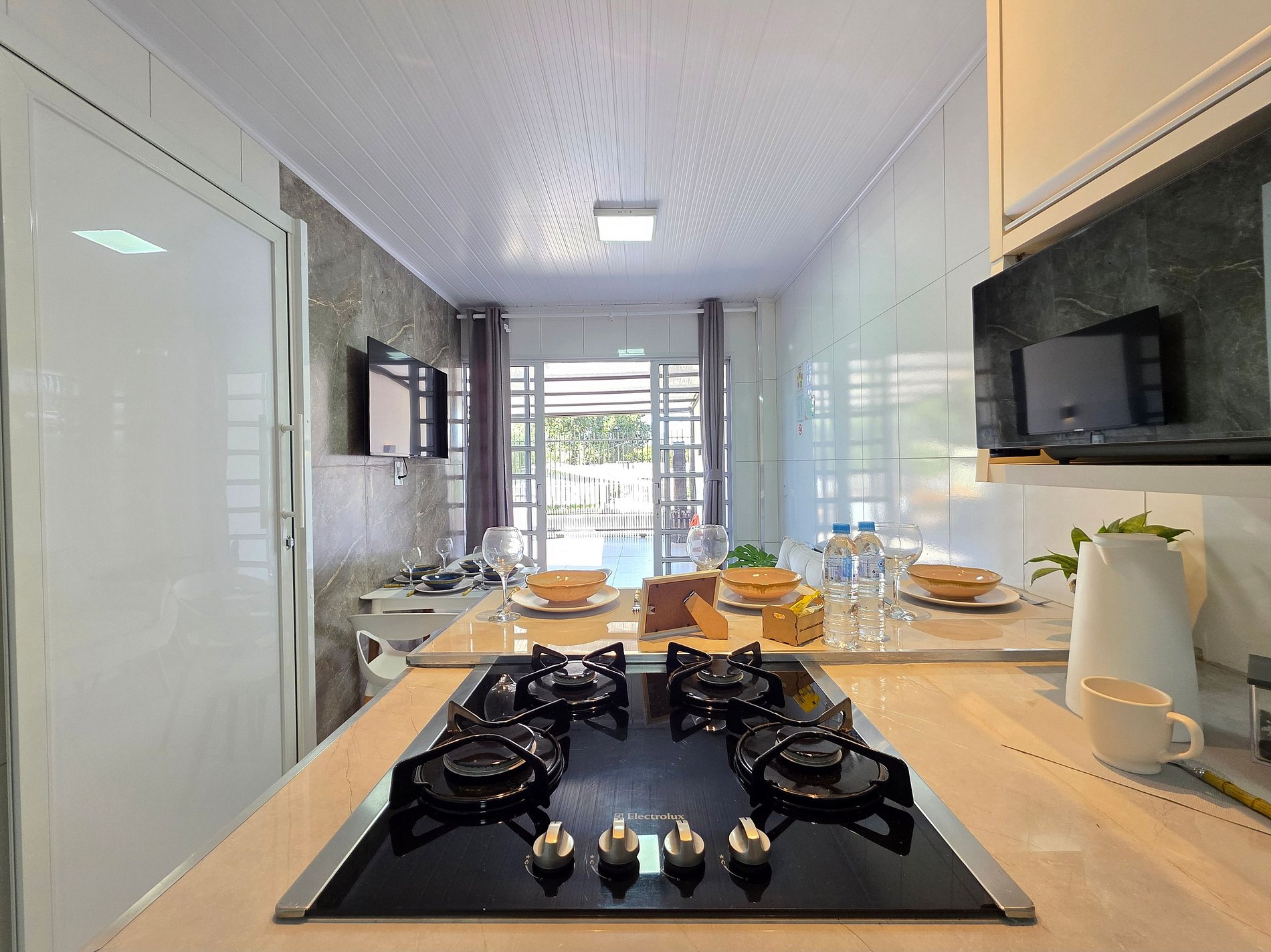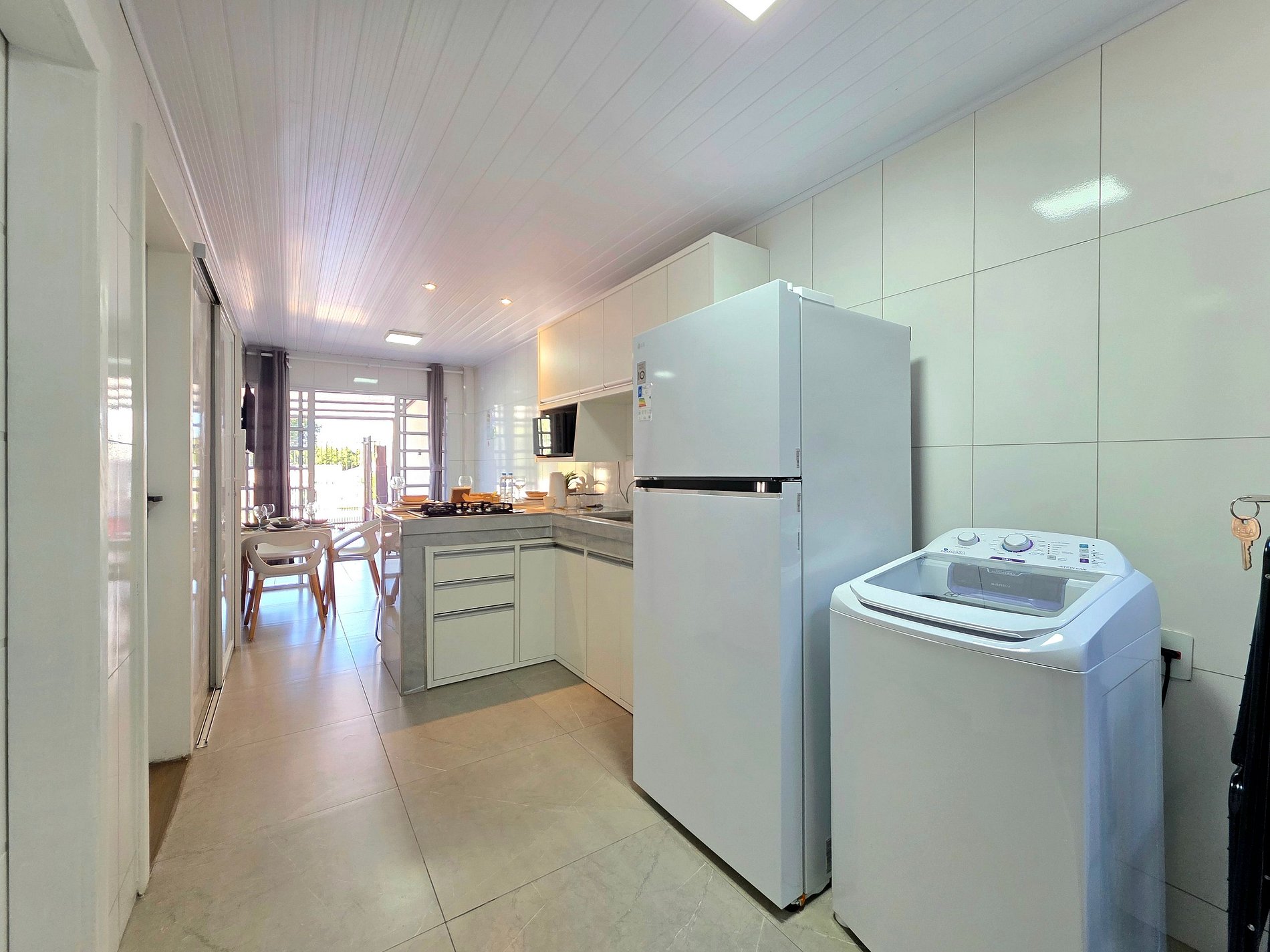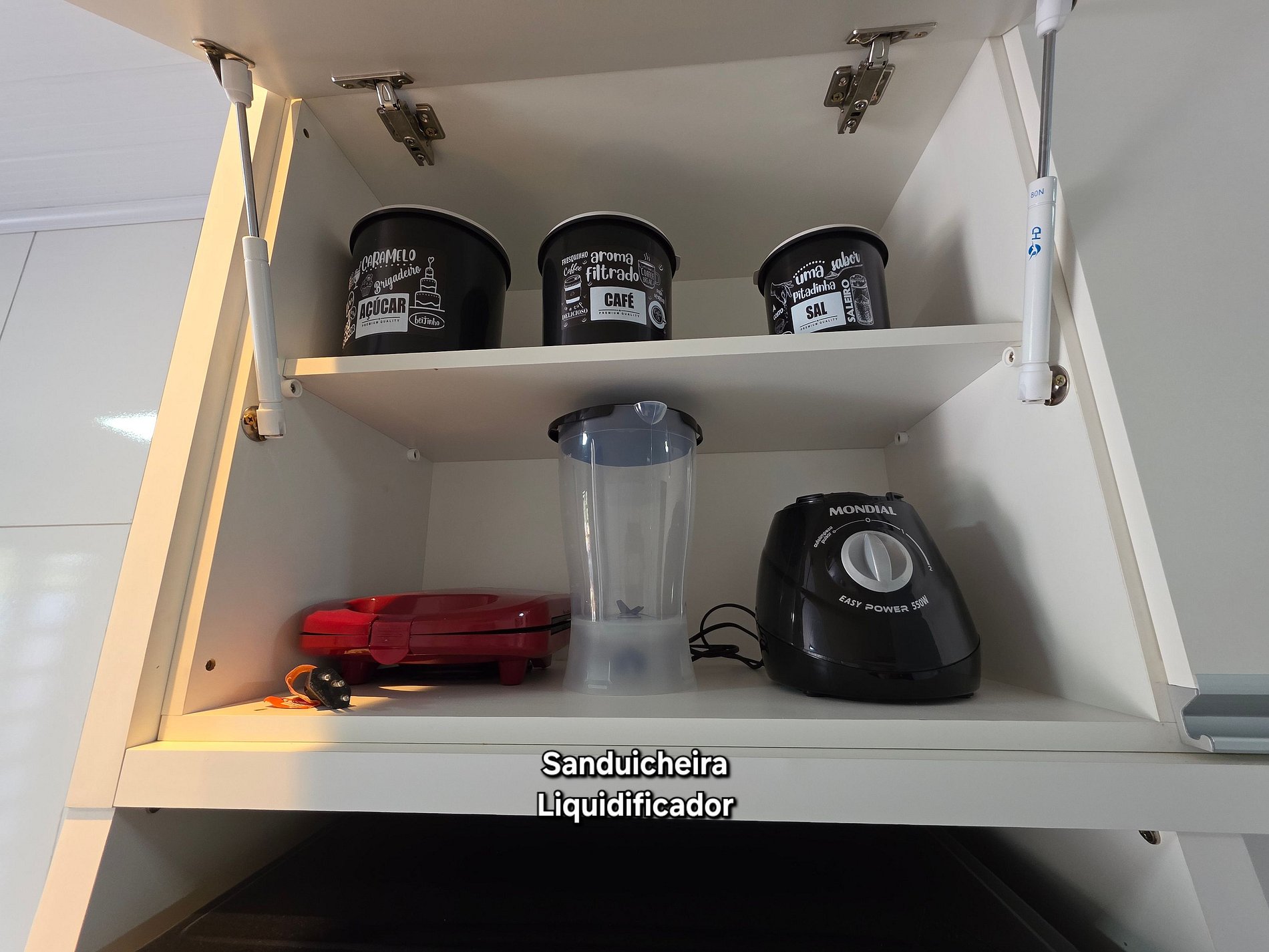 Cozinha completa com utensílios e louças para as refeições, fogão, microondas, sanduicheira, liquidificador.