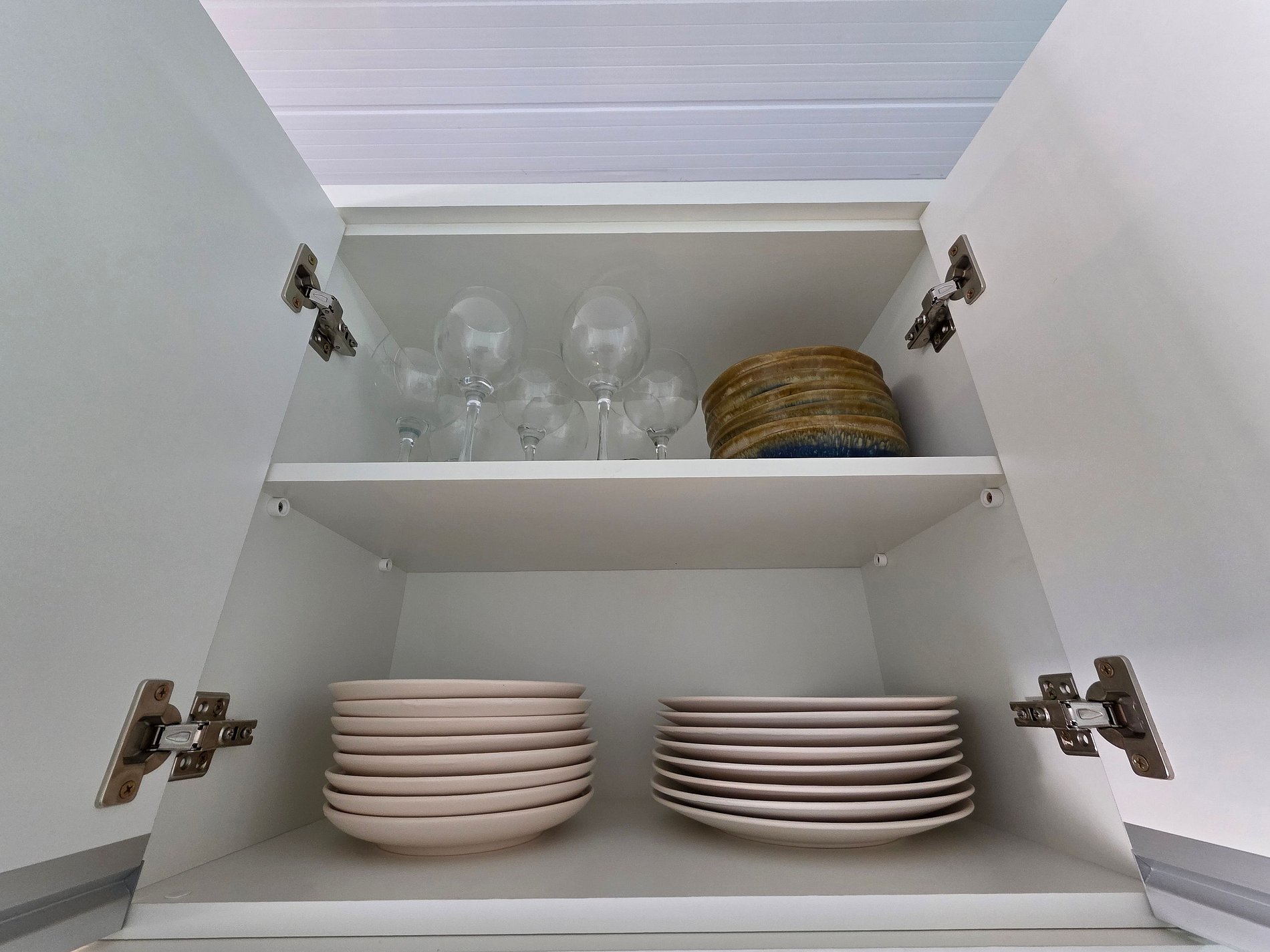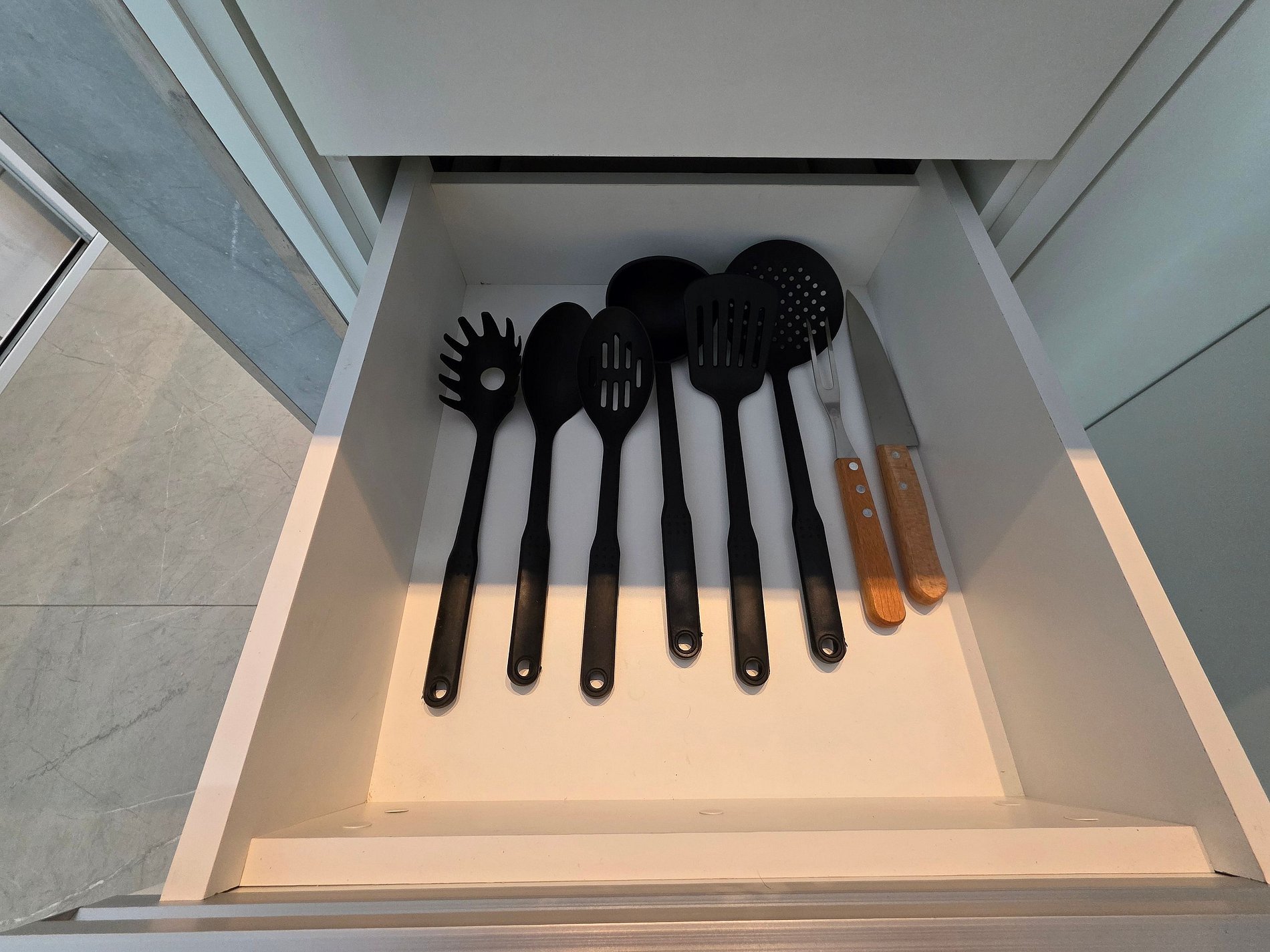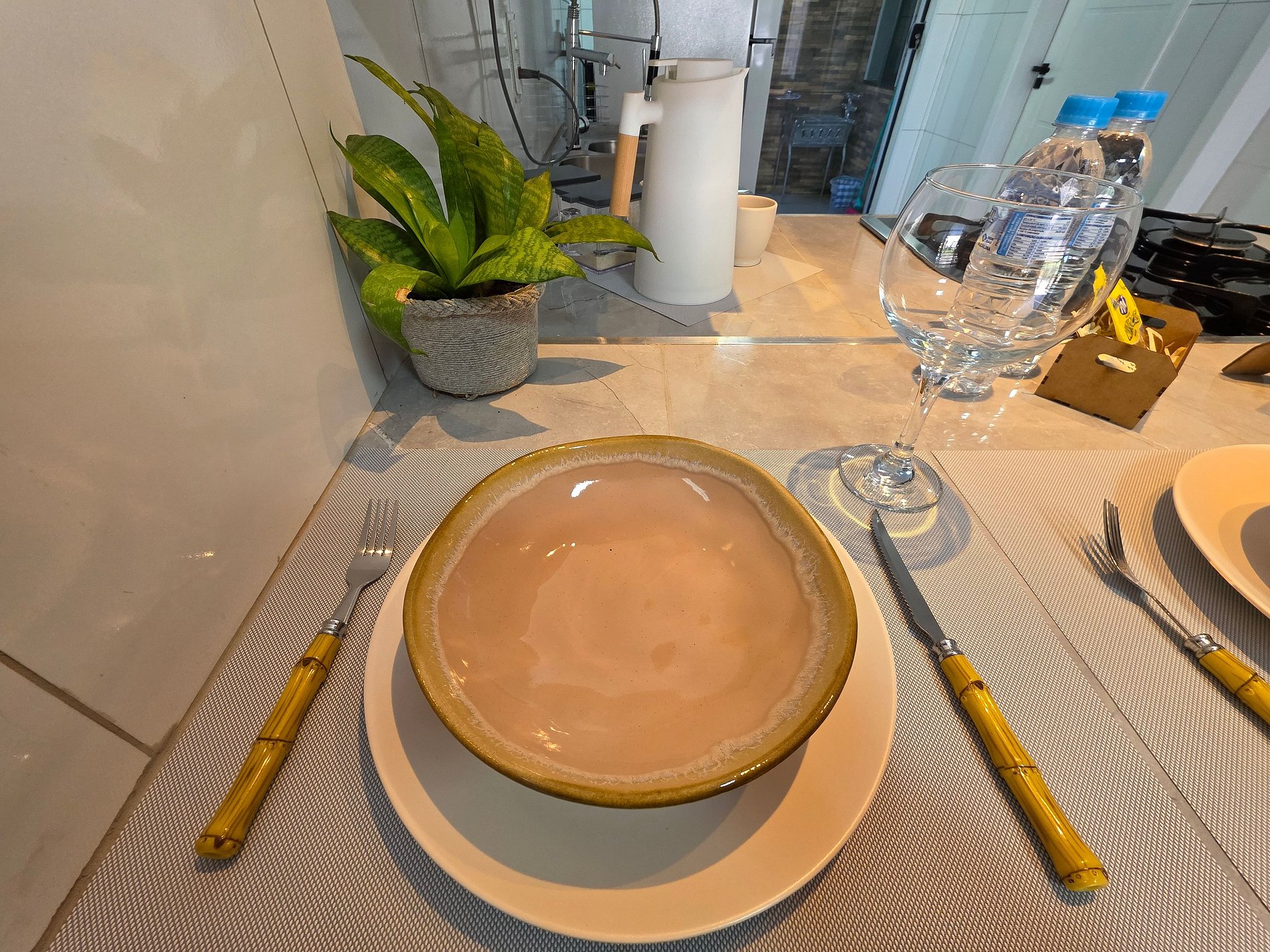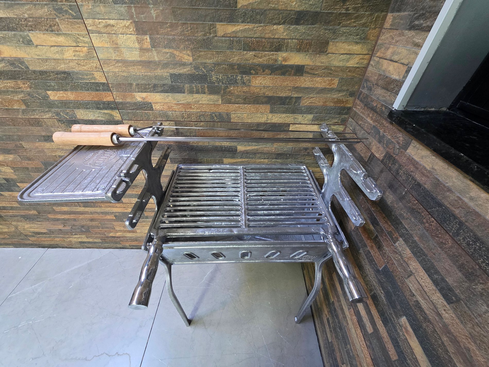 Cozinha completa com utensílios e louças para as refeições, fogão, microondas, sanduicheira, liquidificador.