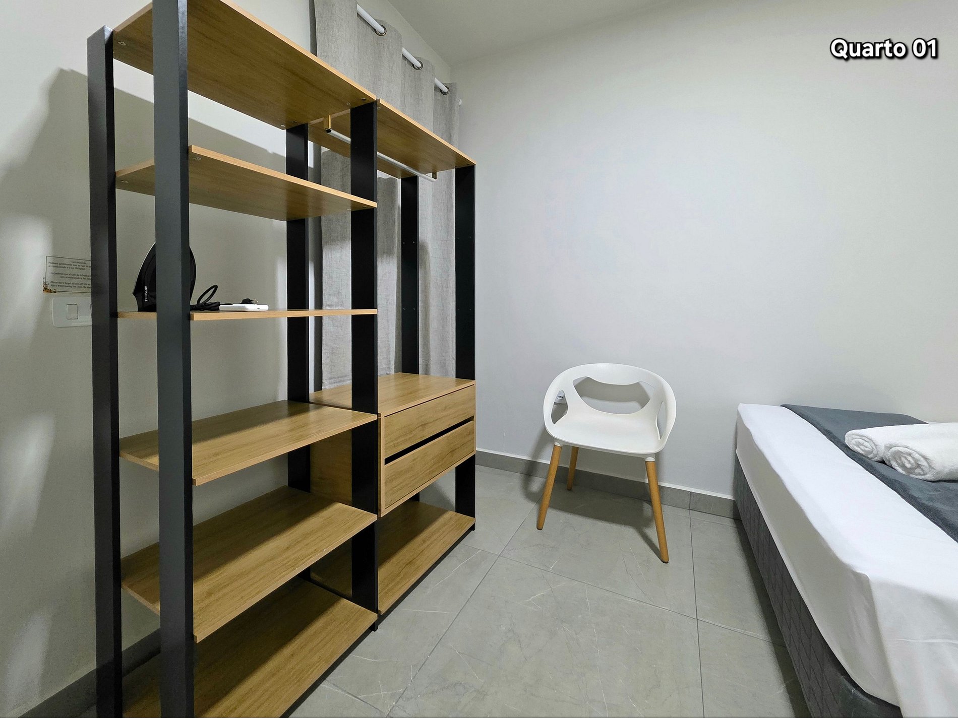 Quarto 01: 01 cama de casal + 01 cama de solteiro com ar condicionado quente/frio.