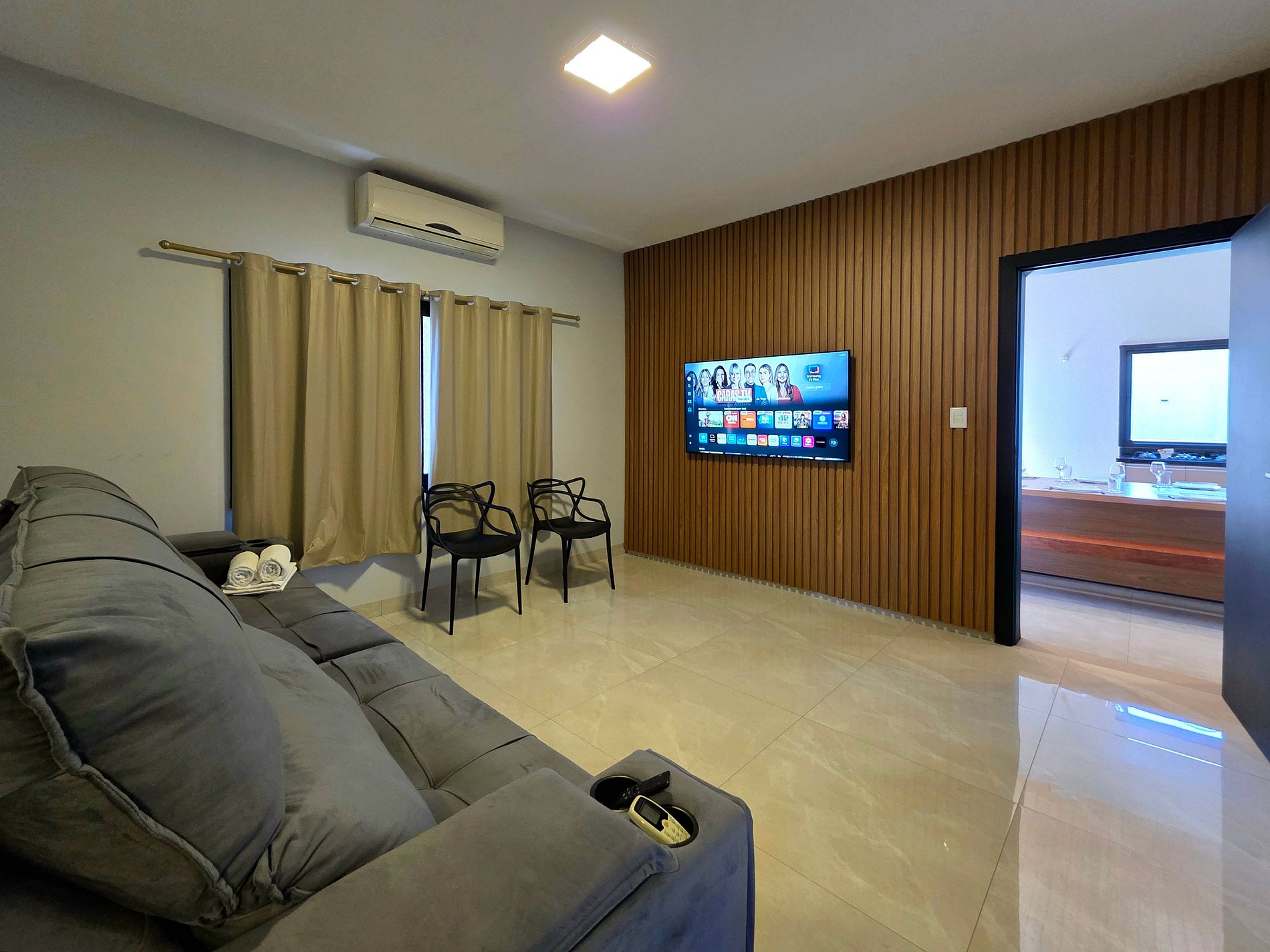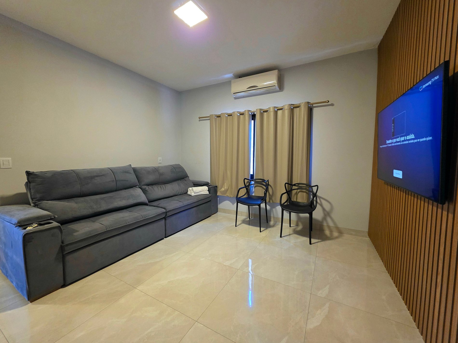 Sala de estar com o sofá cama e smartTV (sofá cama quando 14 hospedes, deixamos a roupa de cama e toalha de banho)