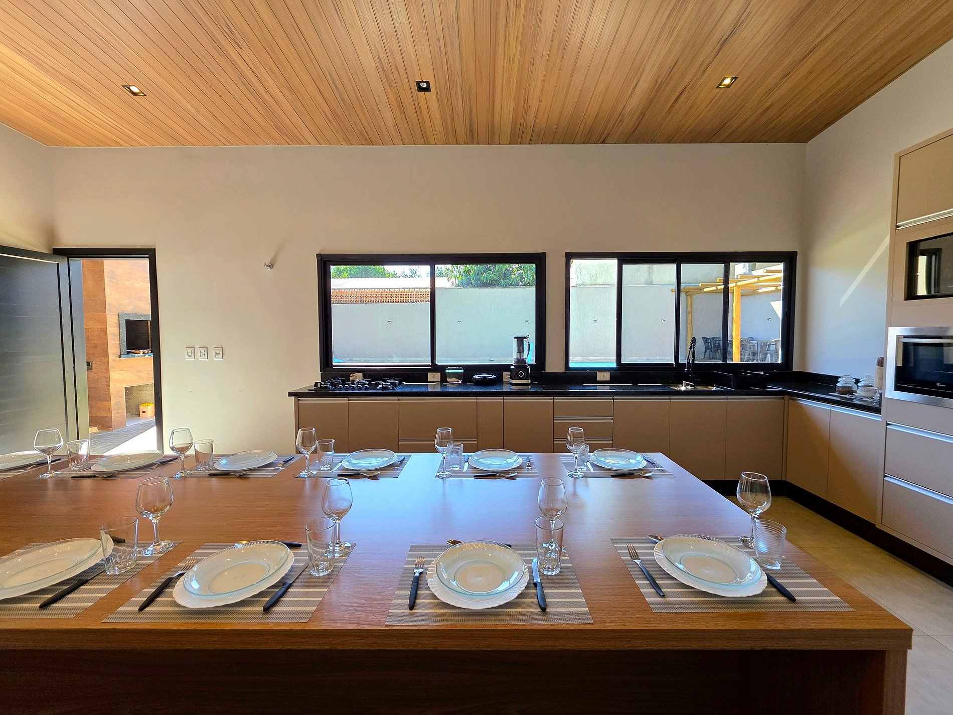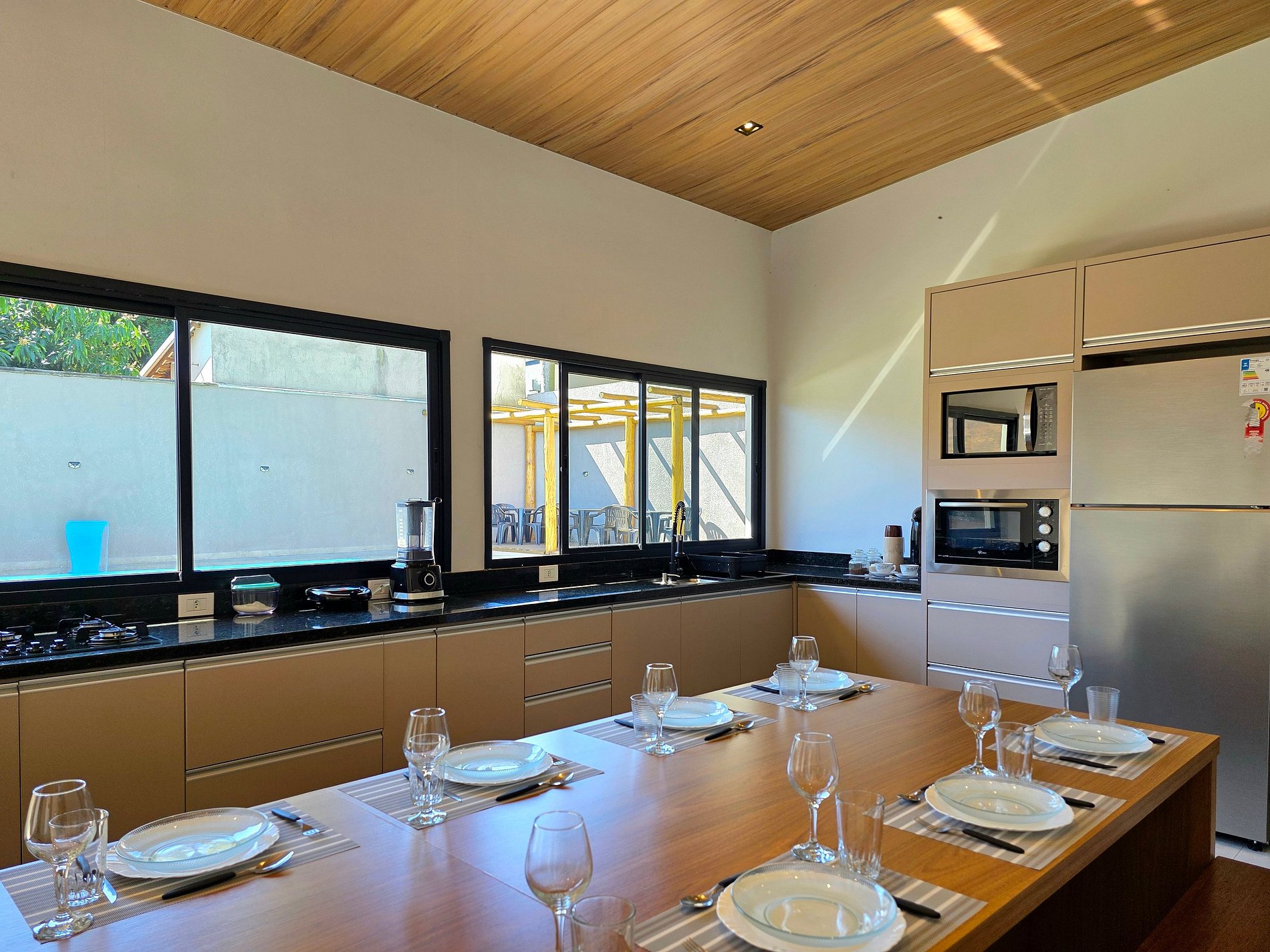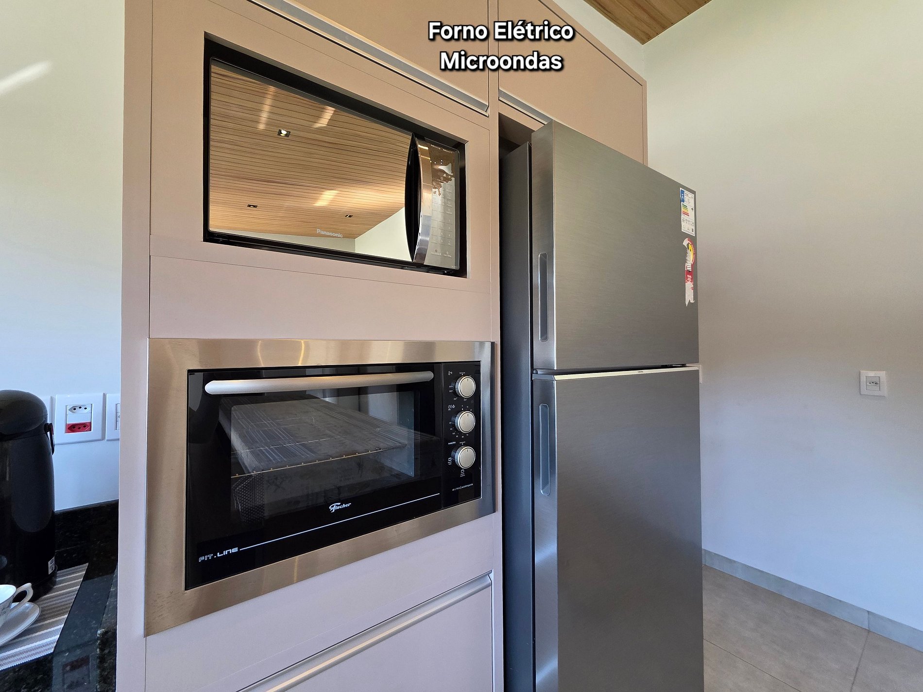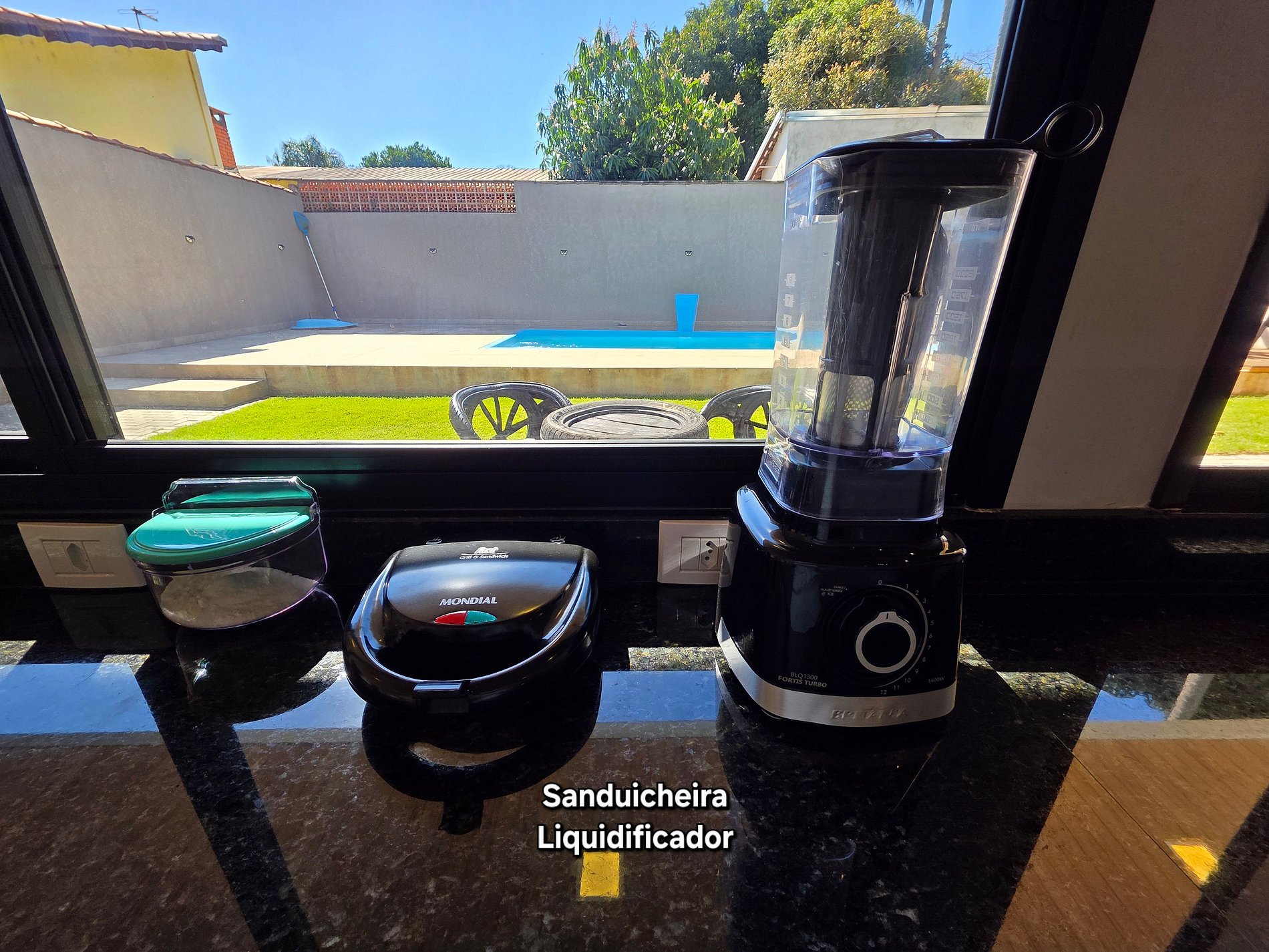 Cozinha completa com todos os utensílios domésticos, sanduicheira, liquidificador, microondas e forno elétrico.