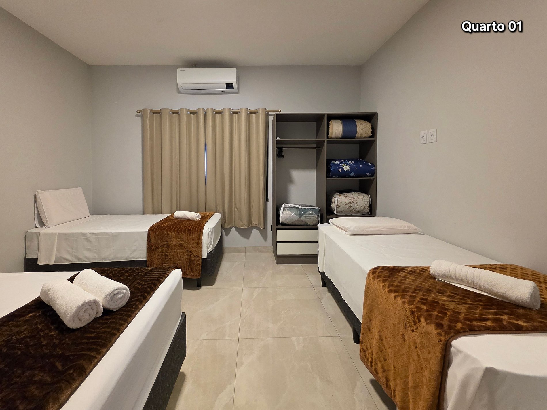 Quarto 01: 01 cama de casal + 02 camas de solteiro (com ar condicionado)