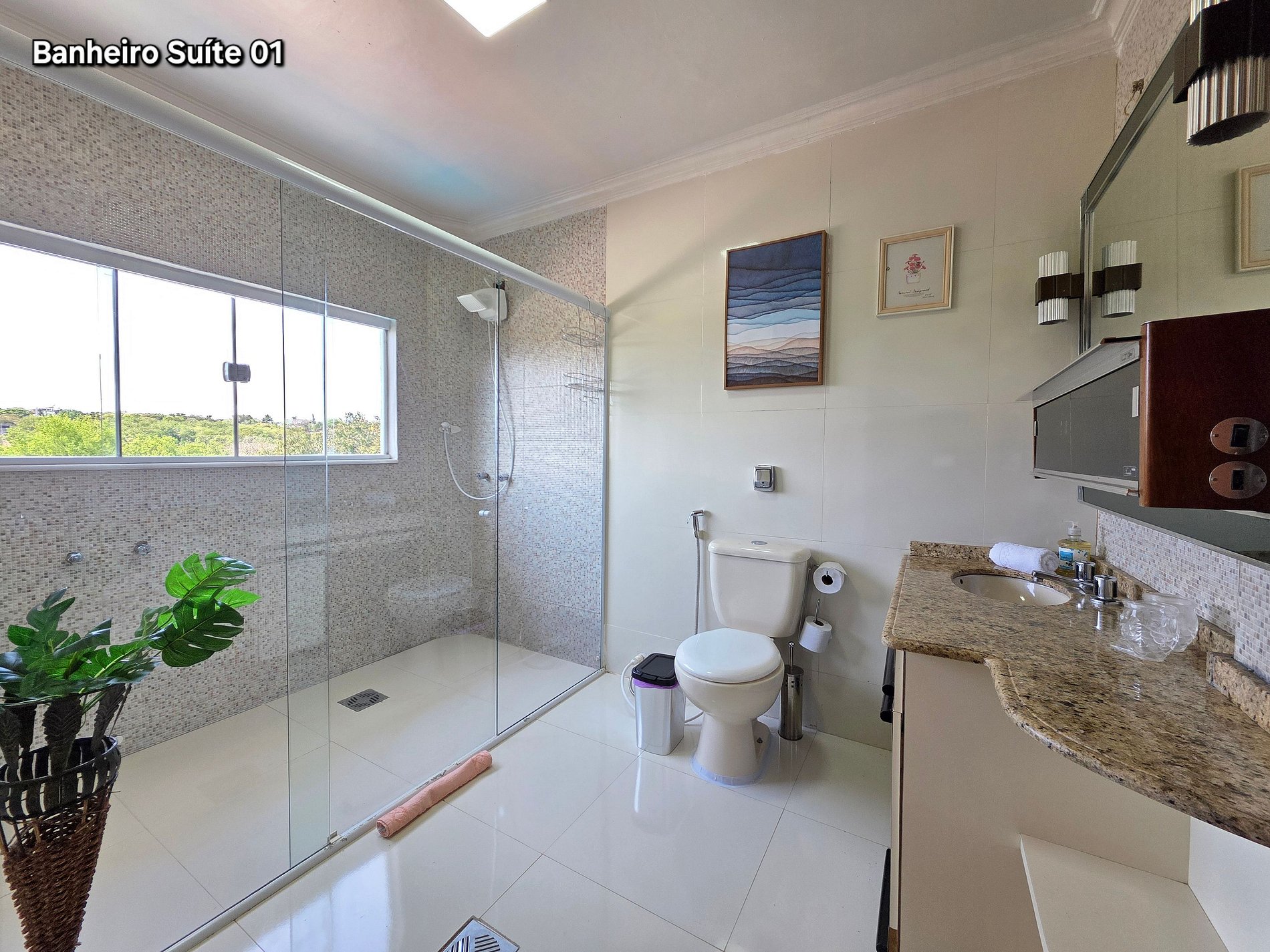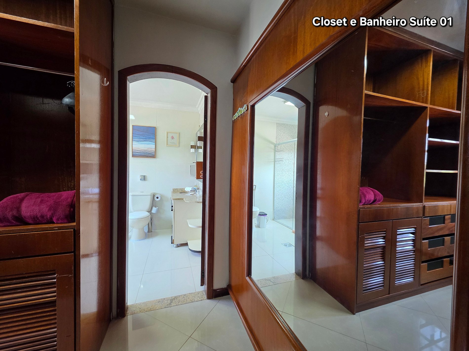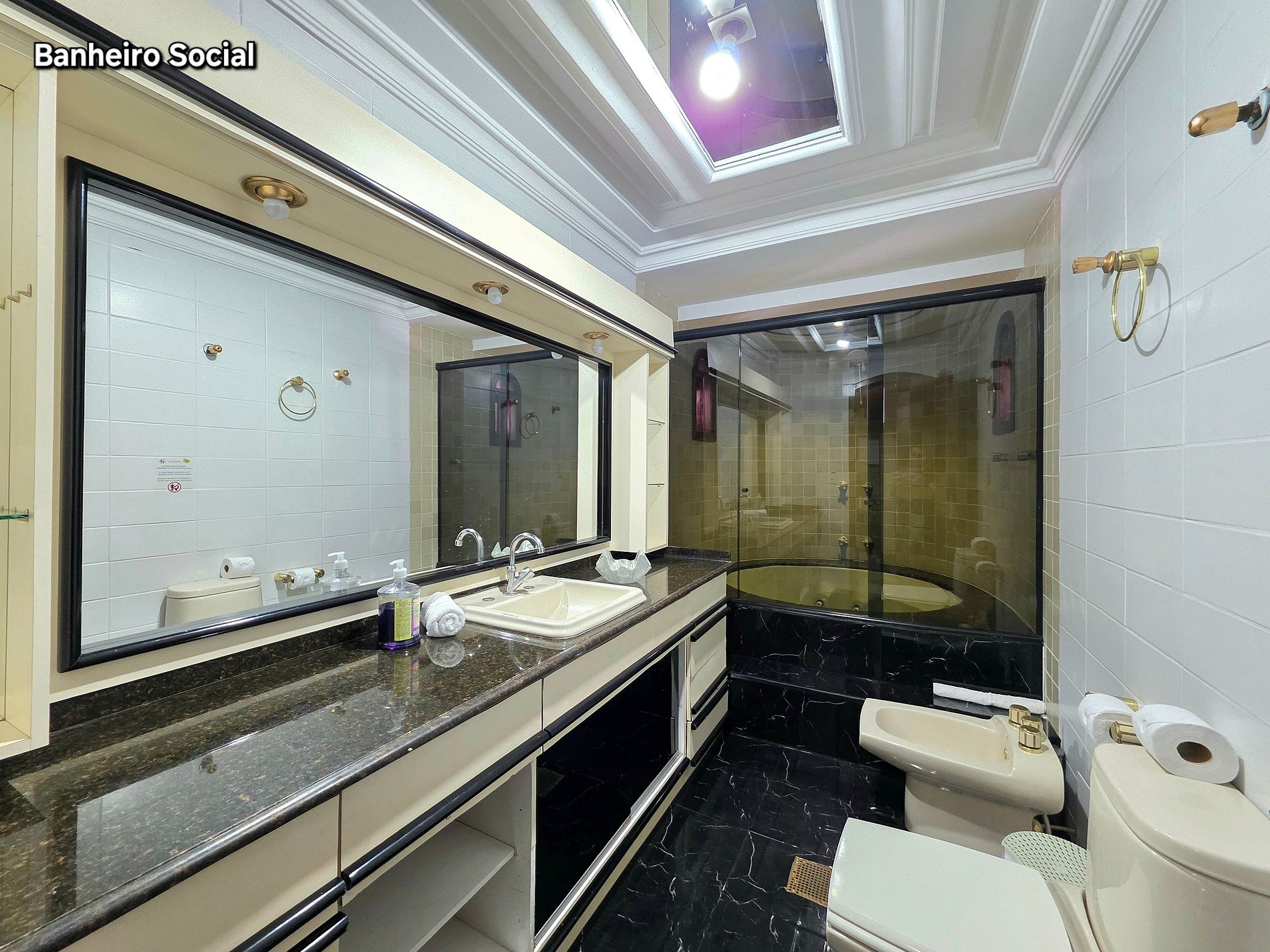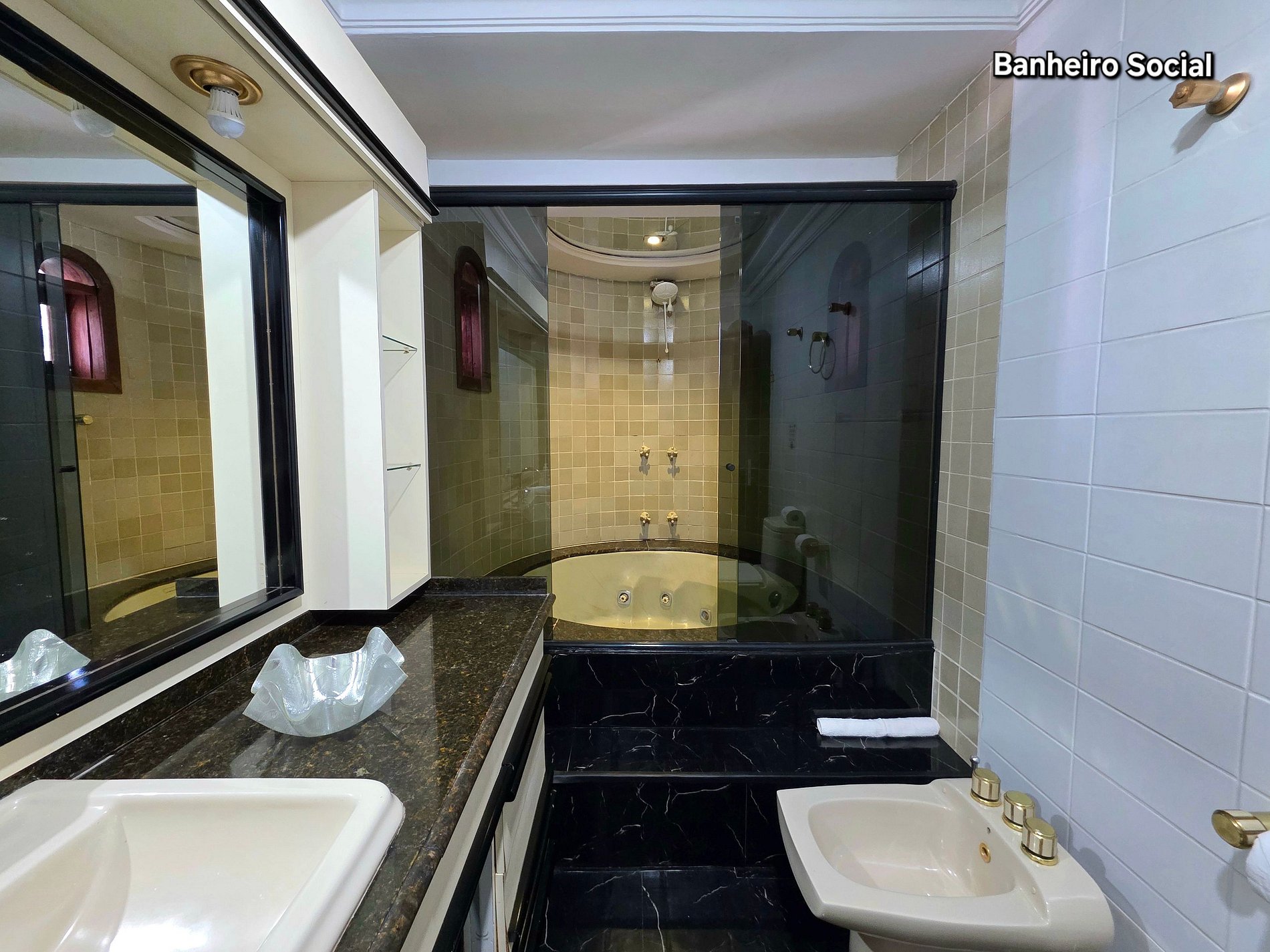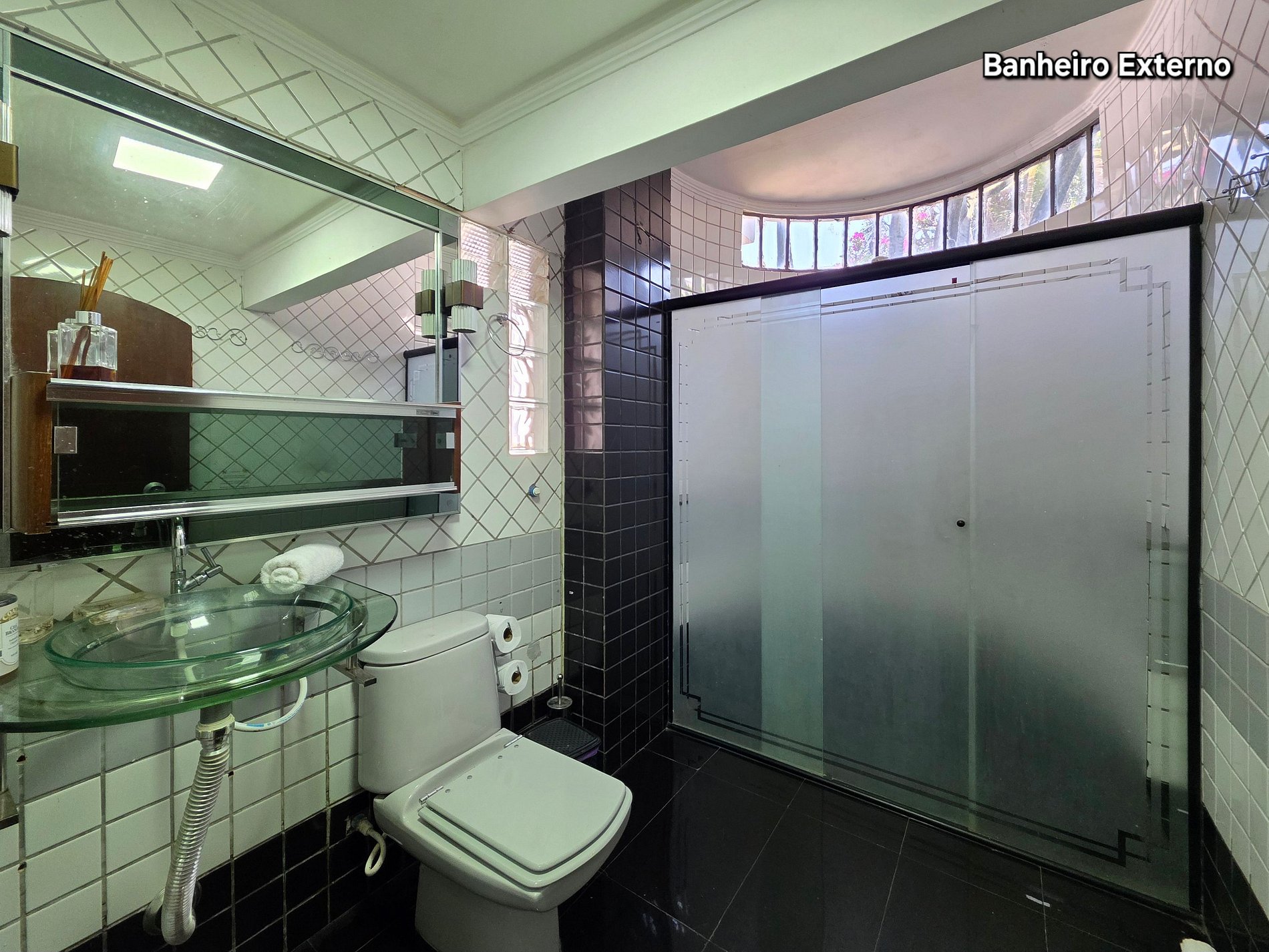 03 banheiros completos, sendo 01 na suíte, 01 social com banheira + 01 banheiro no andar térreo próximo da piscina.