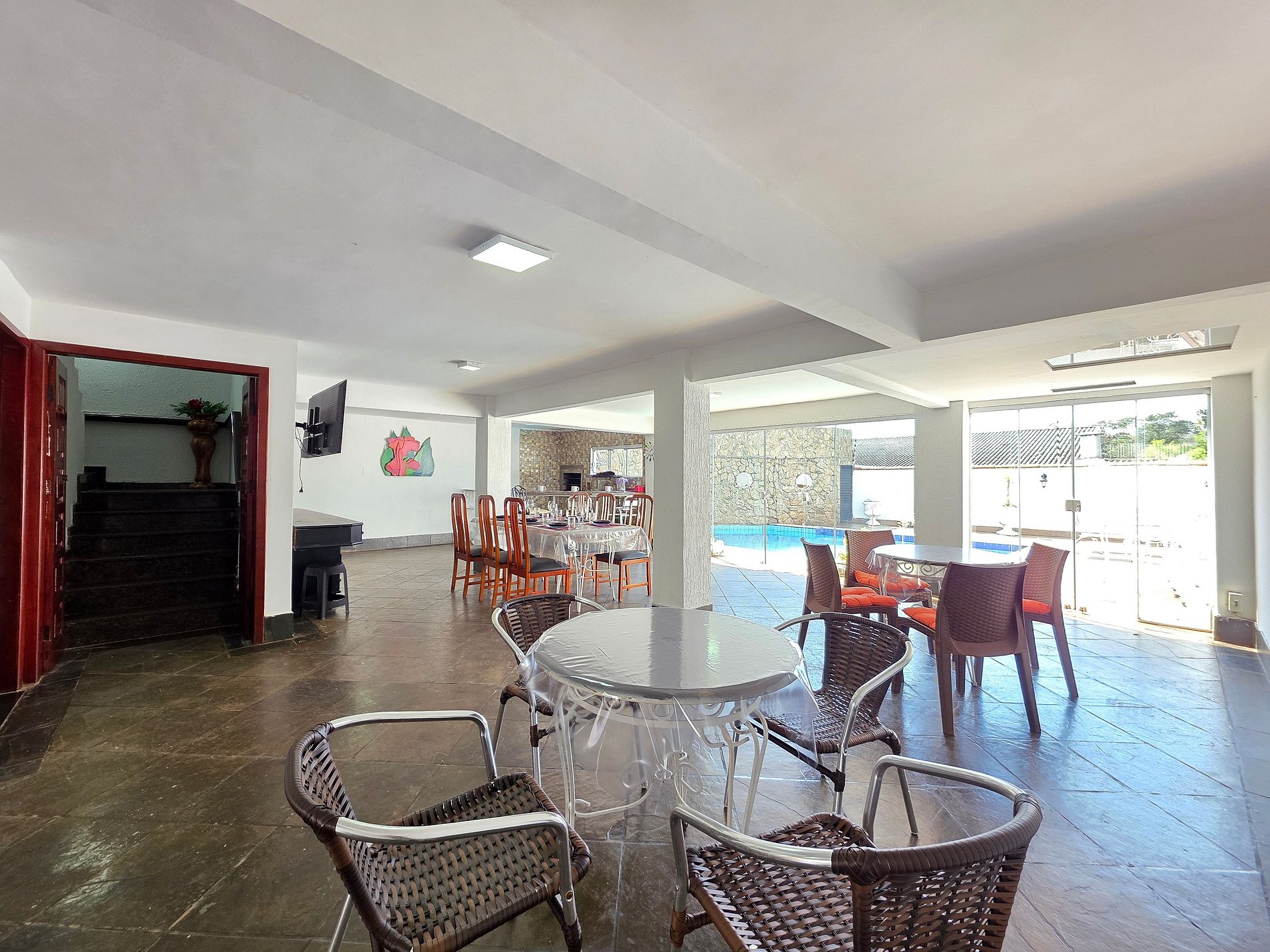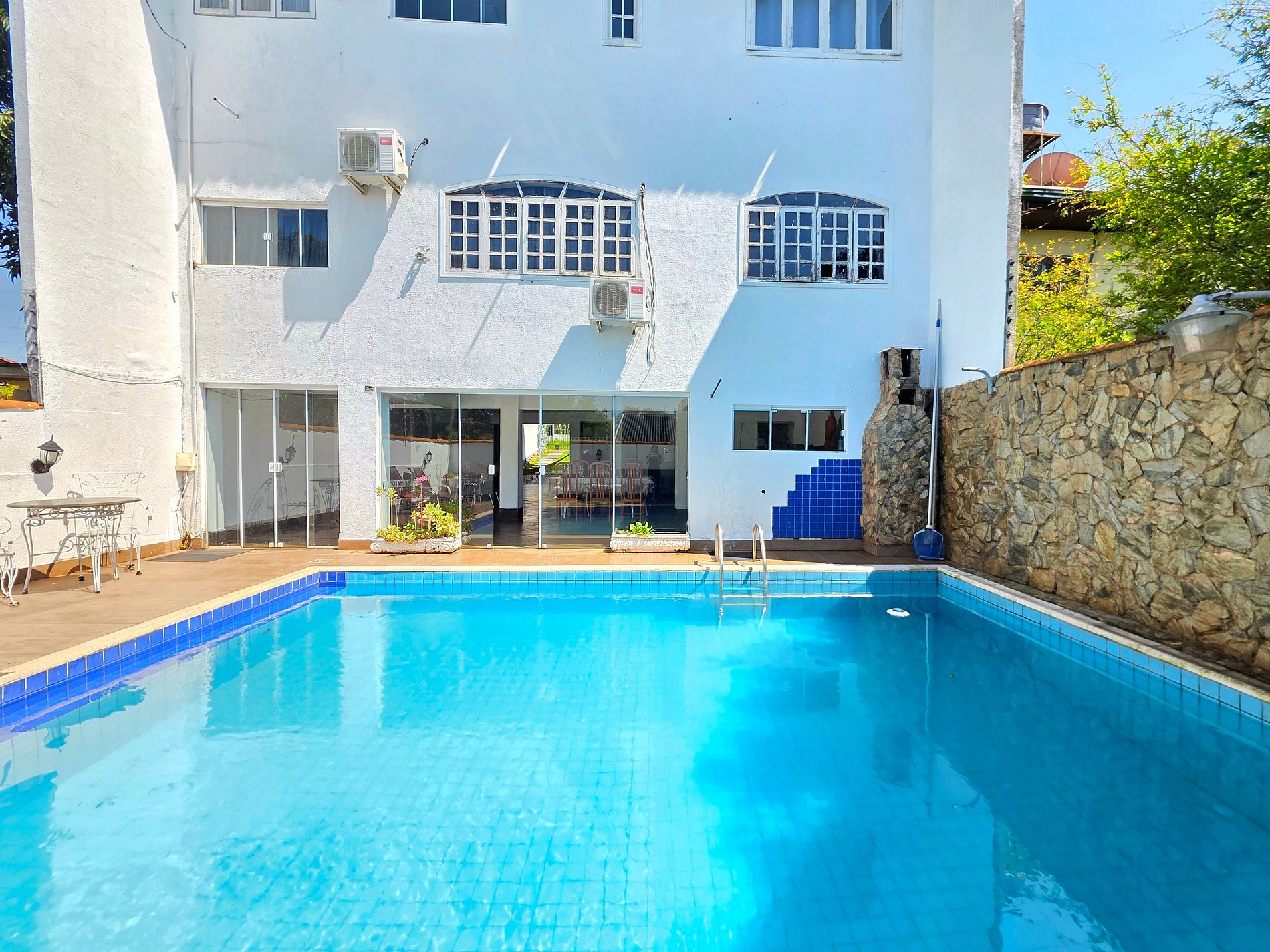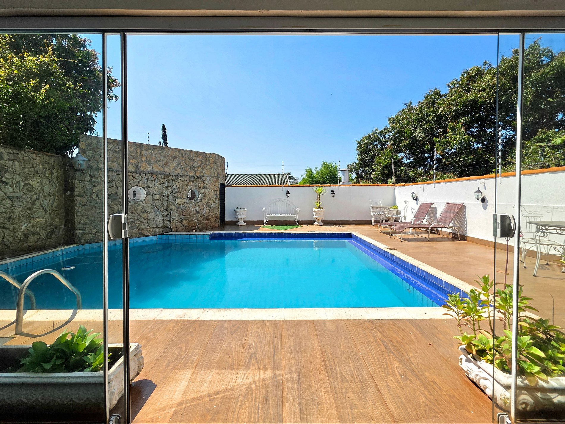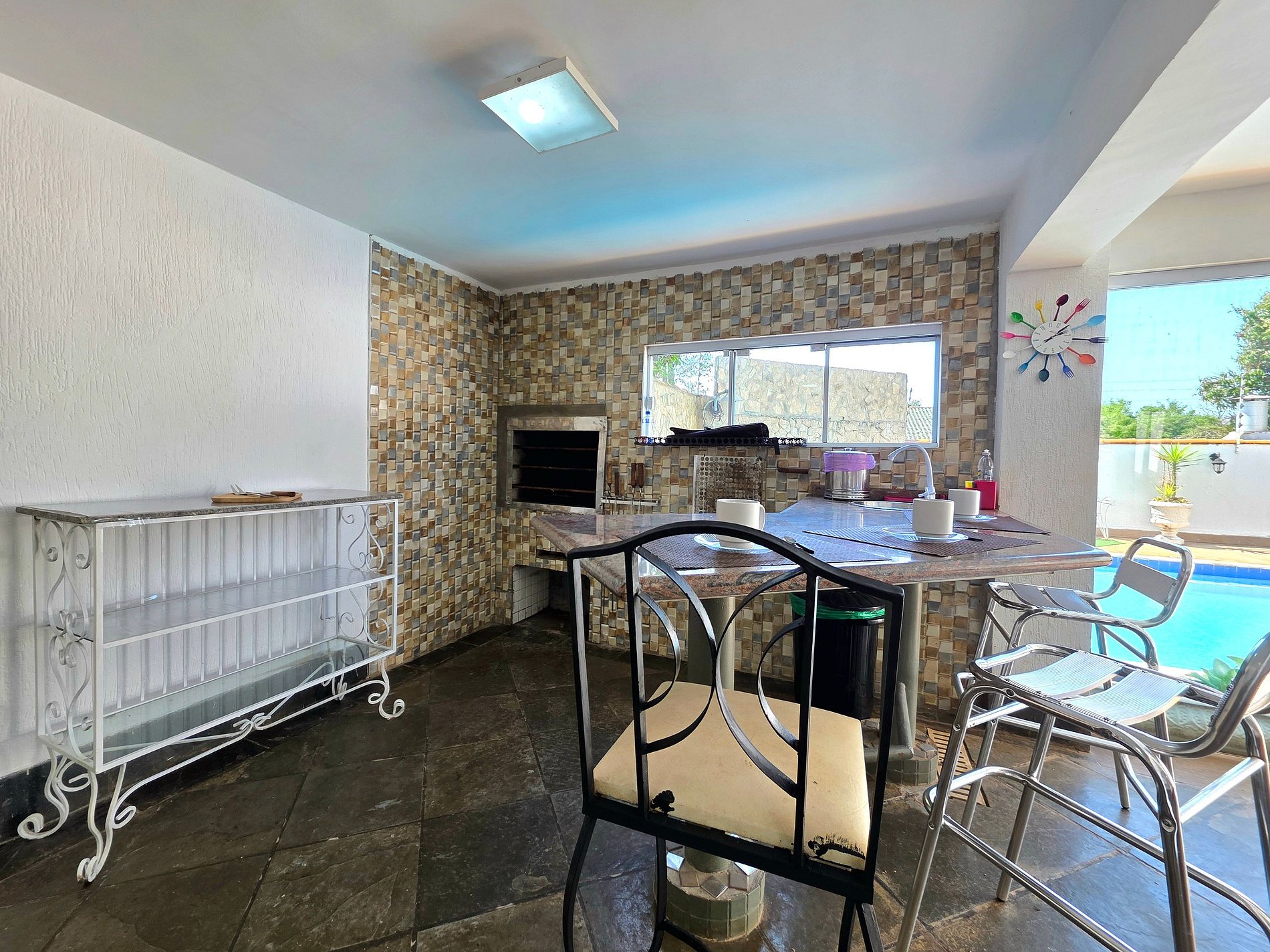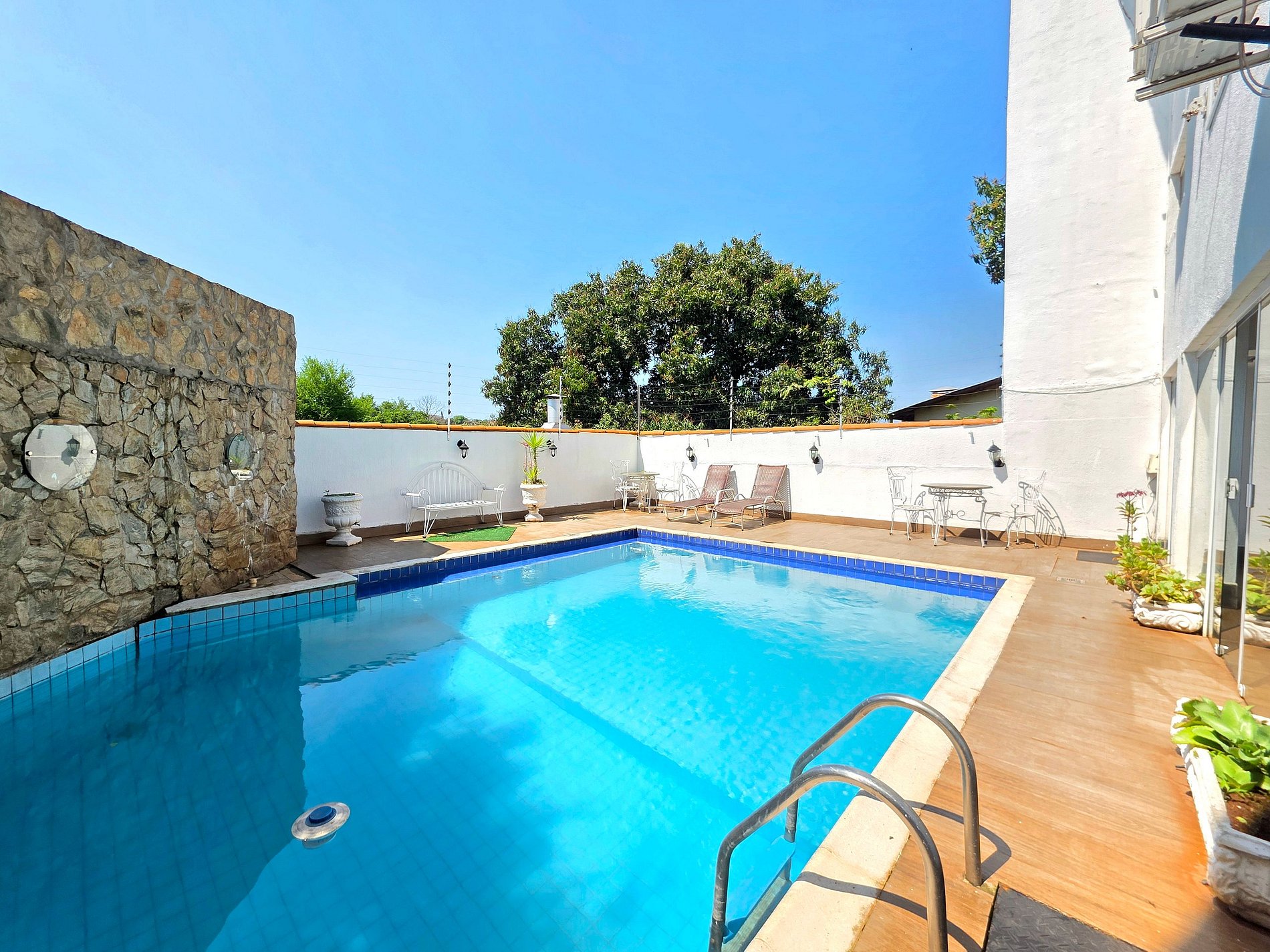 03 banheiros completos, sendo 01 na suíte, 01 social com banheira + 01 banheiro no andar térreo próximo da piscina.