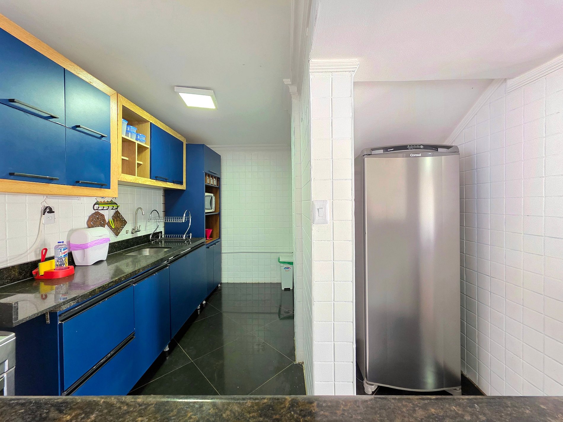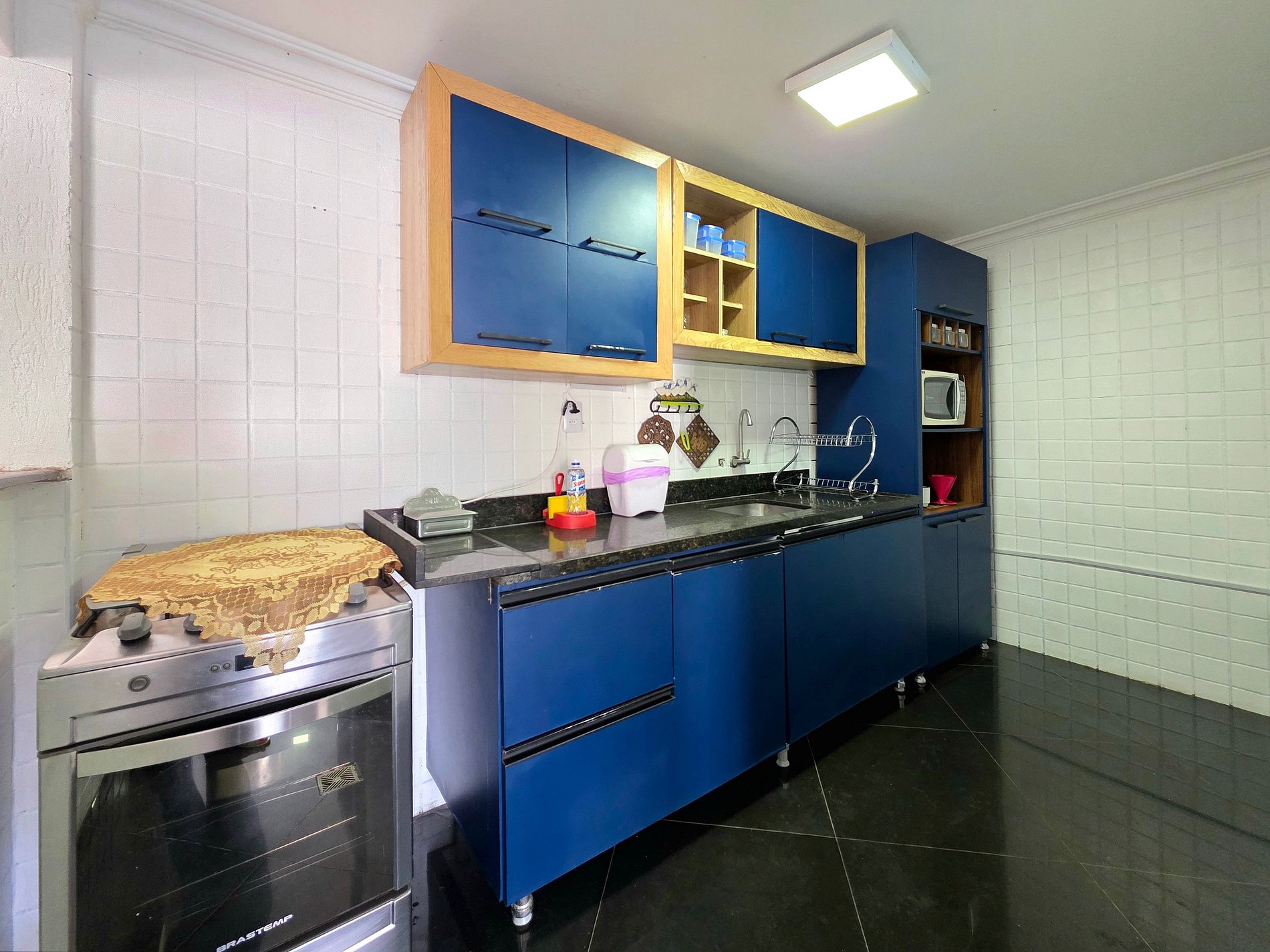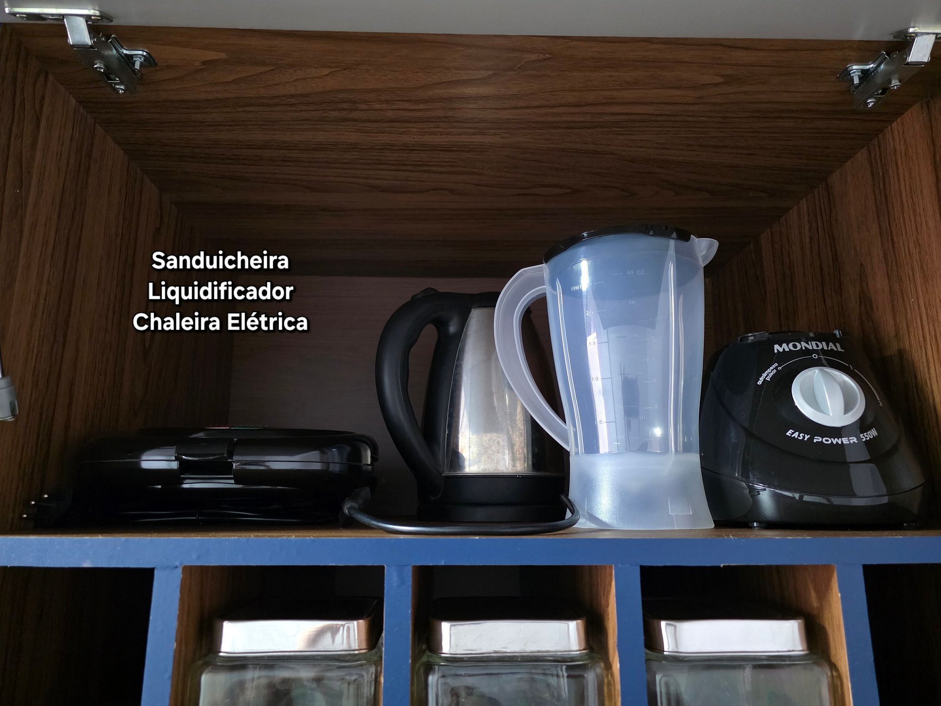Cozinha completa com utensílios e louças para as refeições, microondas, liquidificador, sanduicheira.